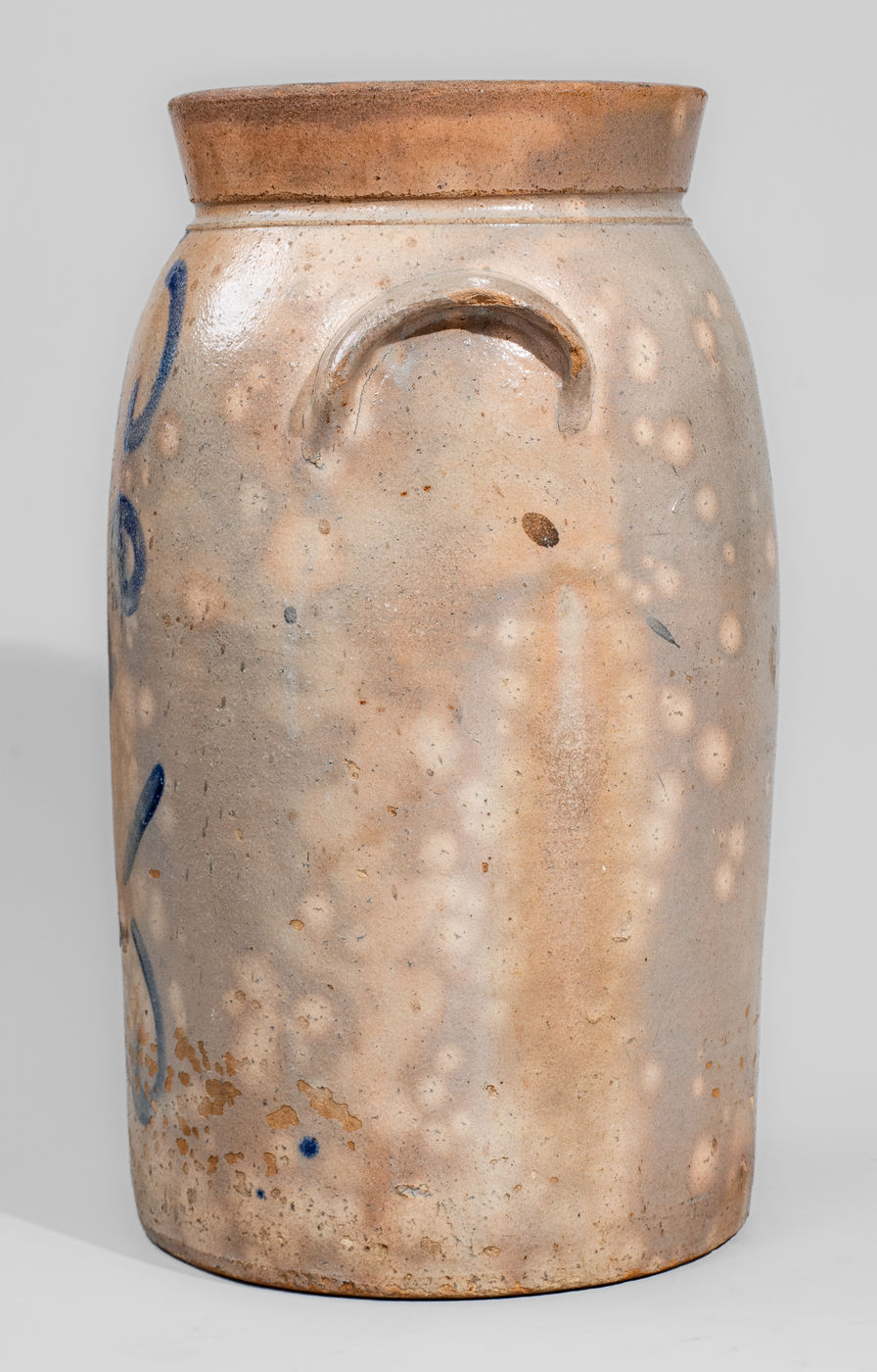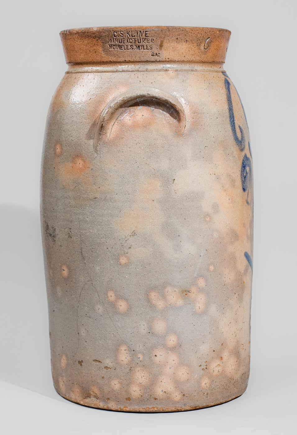 ×C.S. KLINE / MANUFACTURER / HOWELLS.MILLS / GA Six-Gallon Stoneware Churn w/ Elaborate Decoration, c1885