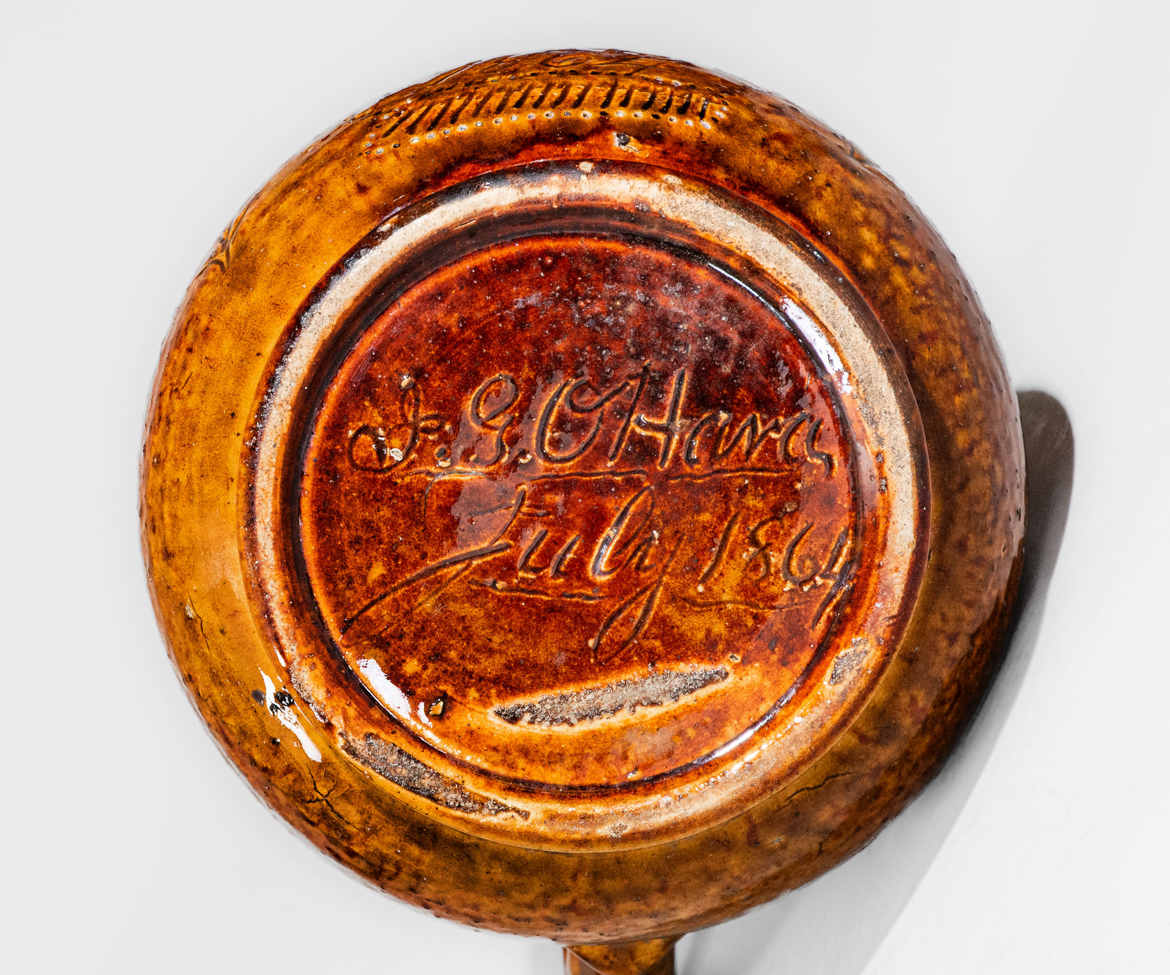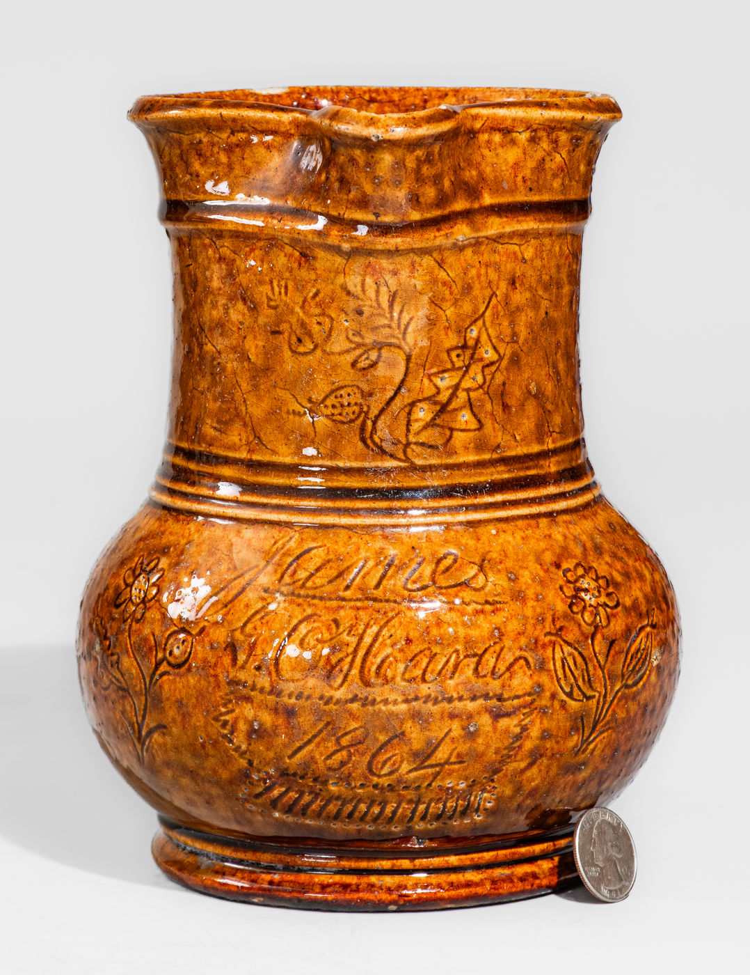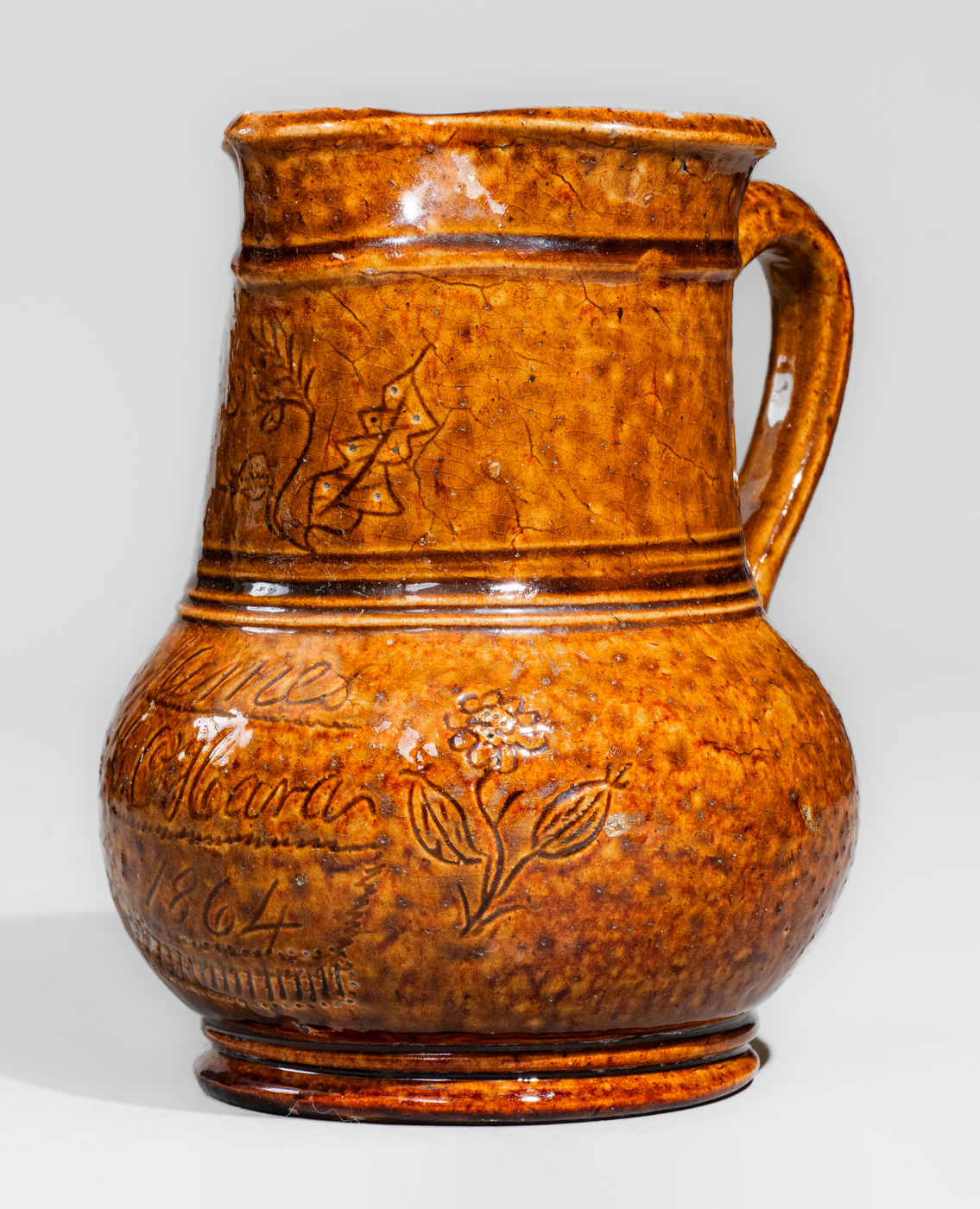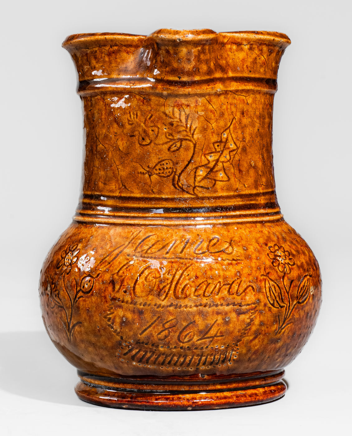 Very Rare Rockingham-Glazed Pottery Pitcher with Incised Floral Decoration, Inscribed "James / G. O'Hara / 1864," James G. O'Hara at the William Hart Pottery, Ogdensburg, NY origin, 1864, ovoid body with footed base and tall collar with heavily-tooled accents and tapered rim molding; front incised with the script signature and date, "James / G. O'Hara / 1864," including incised line and pierced circular accents. Incised floral motifs to the left and right. Front of spout further decorated with an incised floral motif. Recessed underside incised, "J.G. O'Hara / July 1864." According to Ketchum's 1987 Potters and Potteries of New York State, 1650-1900, "[T]he 1865 census indicated that William [Hart] had but a single employee, the potter James G. O'Hara, who appears in various directories between 1863 and 1869." Ketchum goes on to say that while "it appears that the [Hart family pottery] did produce some of this ware [Rockingham Ware], ... no marked ware of this type from Ogdensburg is known, and it is most likely that the 'Rockingham' made here was brown-glazed stoneware rather than the true product." (See Ketchum, p. 396.) This newly surfaced example proves the contrary, its surface covered in a dark amber Rockingham glaze. Very nice condition with some shallow chipping to spout and rim. H 8".