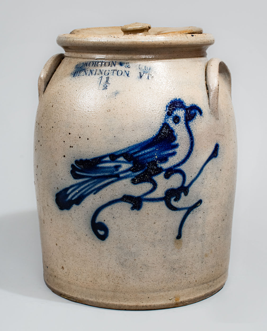 ×J. NORTON & CO / BENNINGTON VT Lidded Stoneware Bird Jar, circa 1860