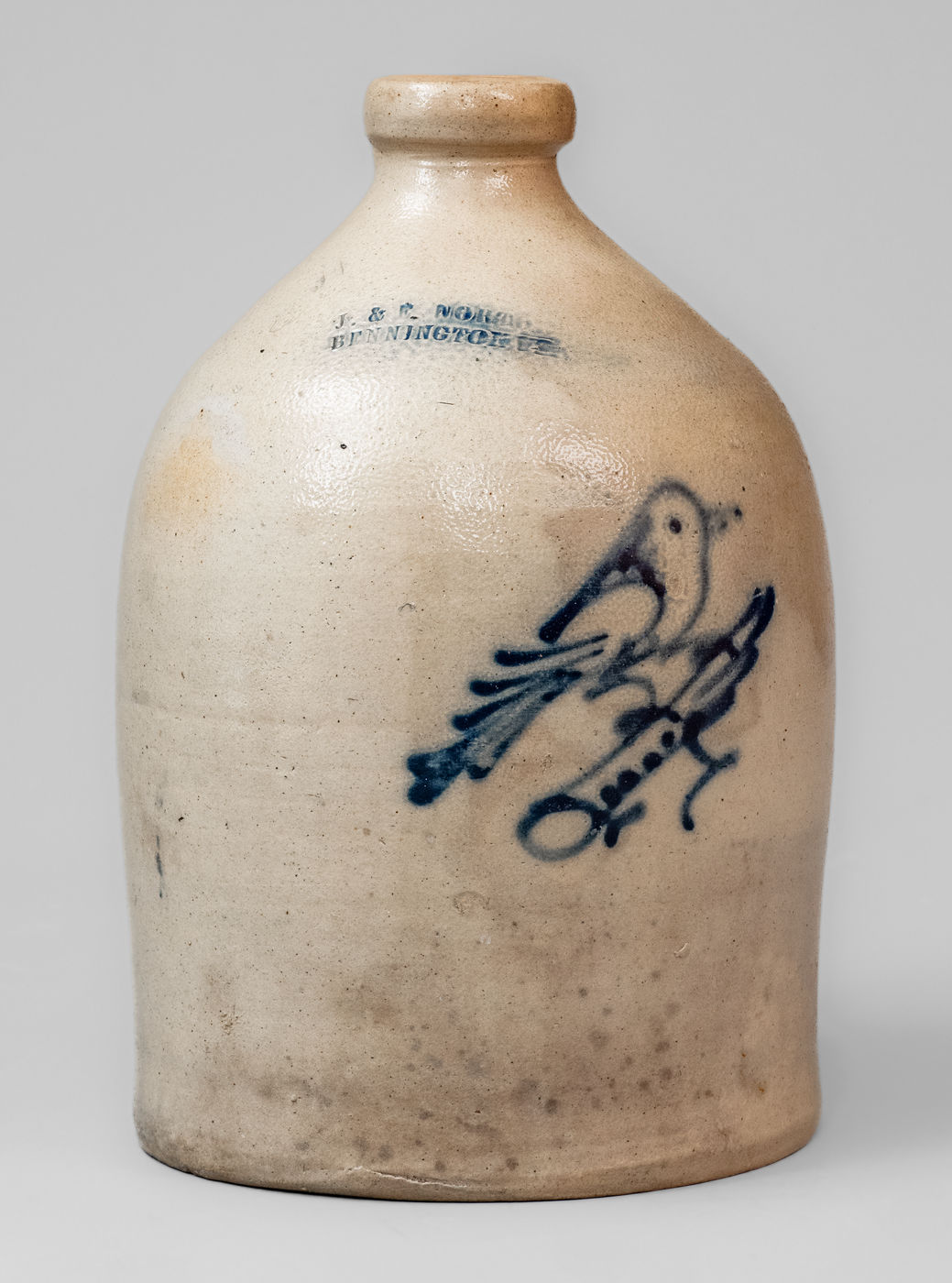 ×J. & E. NORTON / BENNINGTON VT One-Gallon Stoneware Bird Jug, c1855