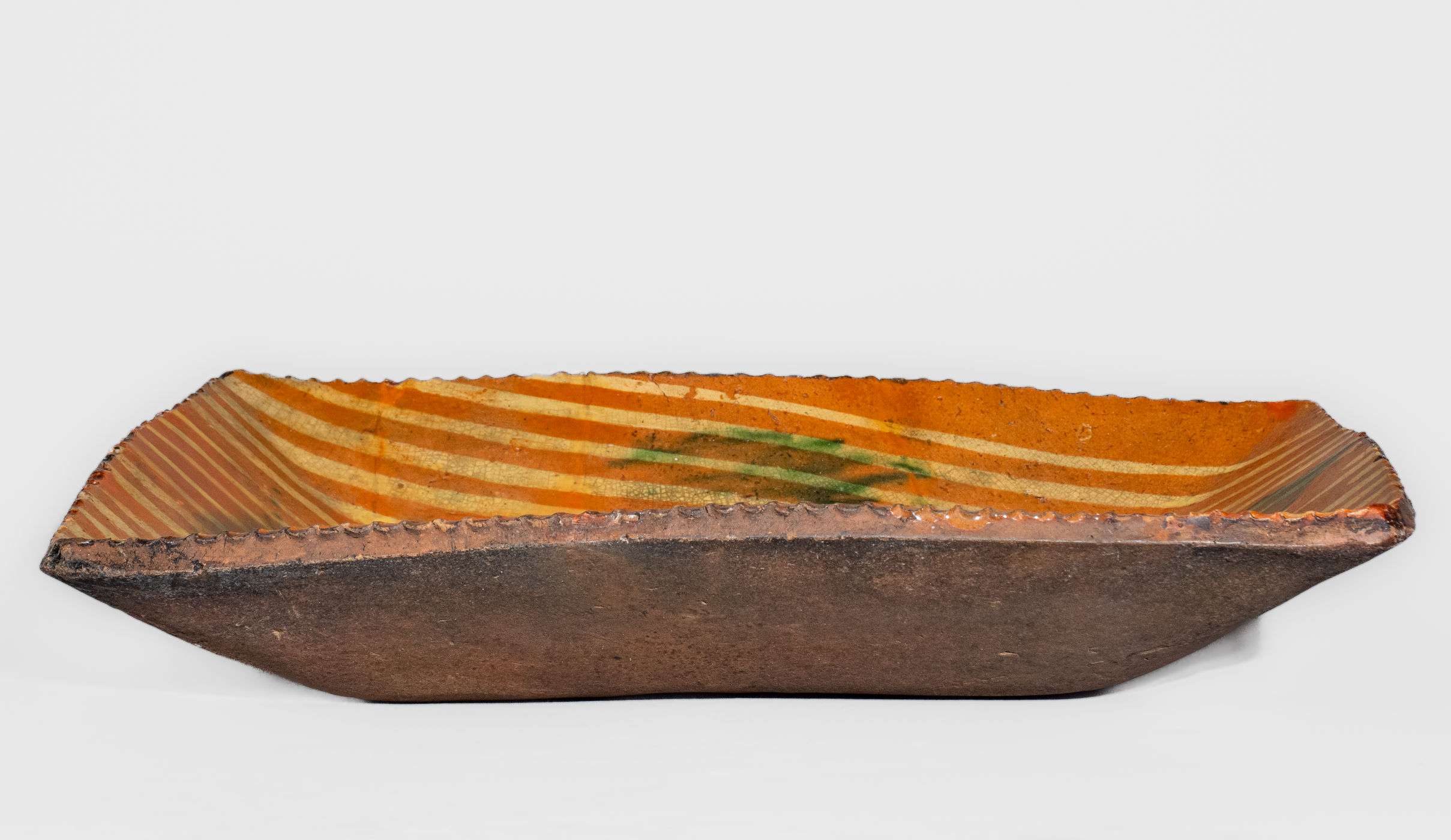 ×Large-Sized Philadelphia, PA Redware Loaf Dish w/ Two-Color Slip Decoration, late 18th century