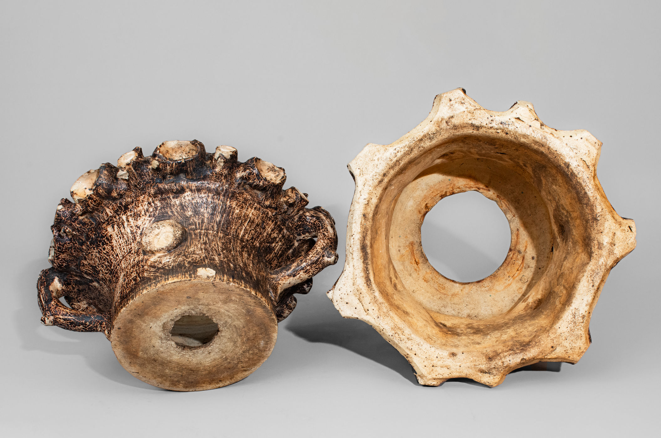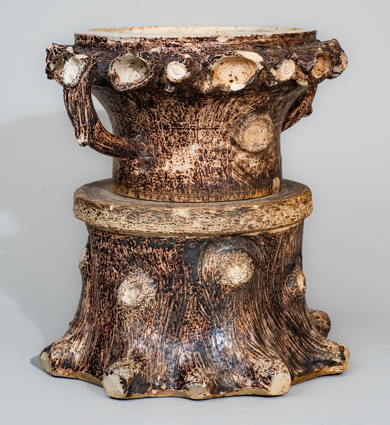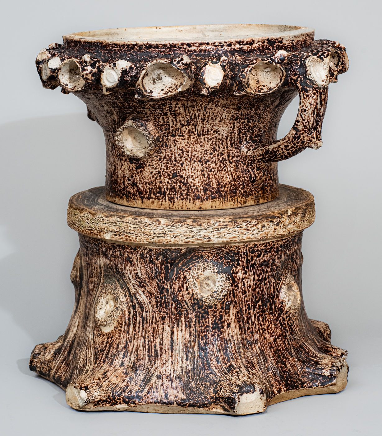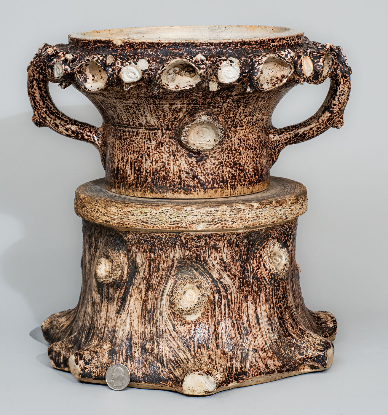 Very Rare Manganese-Decorated Stoneware Rustic Flowerpot with Base, attributed to Jacob Bachley, Texarkana Pottery, Texarkana, AR, circa 1880, wheel-thrown flowerpot with vertical twig-form handles and elaborate hand-modeled and applied clay knots and sawed limbs bordering the rim, the surface heavily-incised to resemble bark and further decorated on the front and reverse with an applied knot to the body. Includes original, separately thrown and fired base in the form of a tree stump with applied knots and incised bark including stippled treatment. Each potted with a drain hole. Surface of each highlighted in reddish-brown manganese slip and covered in a clear salt glaze. The distinctive color of the clay and slip leads to a strong attribution to the Anna-influenced, French-born potter, Jacob Bachley, at his Texarkana Pottery. Flowerpot with a large flake to original drain hole on interior base, partially extending to underside of flowerpot. Additionally, chips to rim and applied knots and sawed limb treatment at rim and a 5/8" flake to bottom edge of flowerpot. Base with chipping around wide drain hole in top as well as some small chips to top and bottom edge. H 13" ; W (including handles) 13".