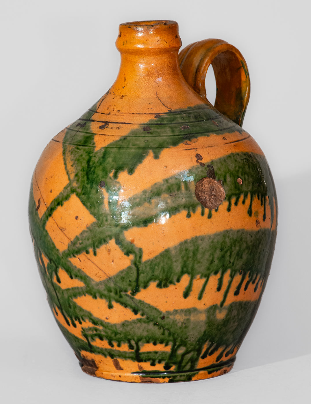 ×Rare Greene County, TN Redware Jug w/ Profuse Copper Slip Decoration, attrib. Christopher Alexander Haun