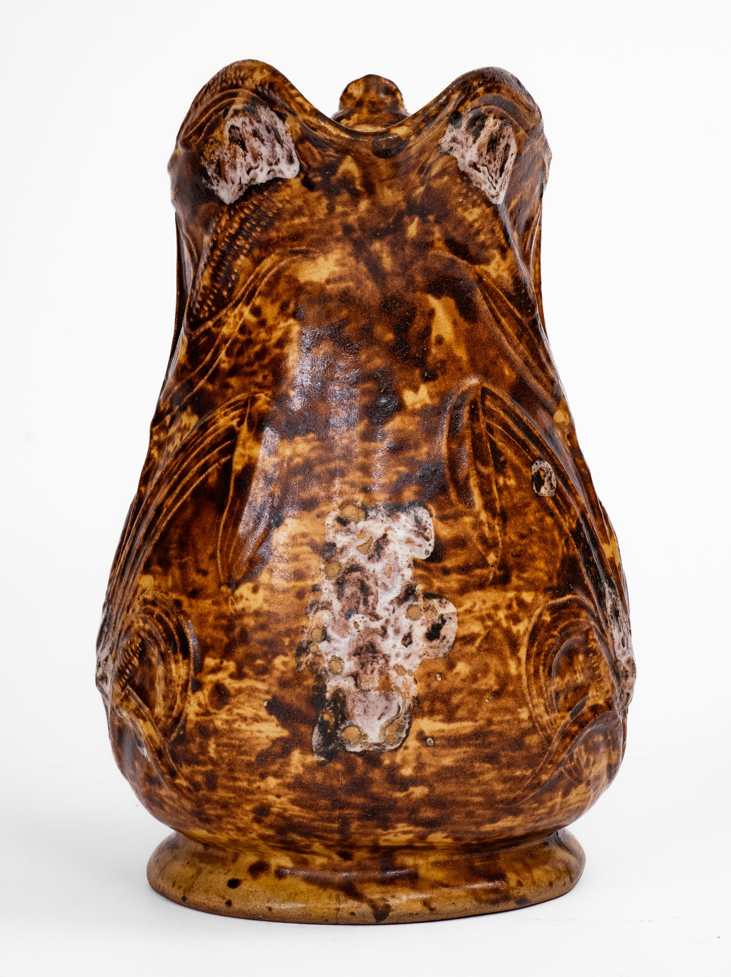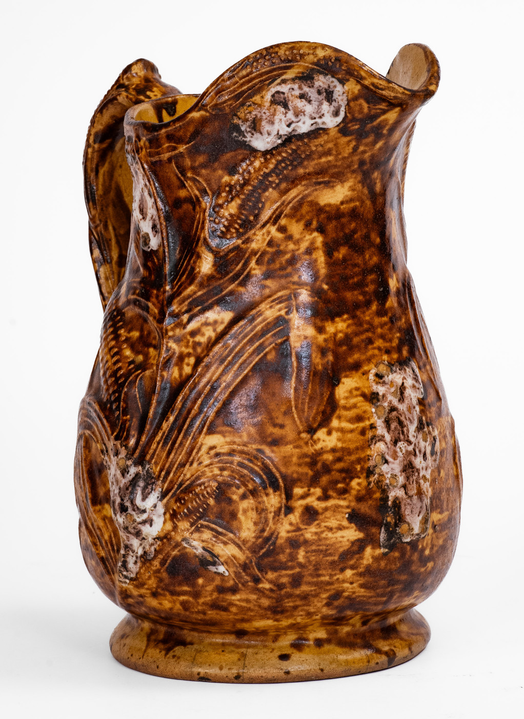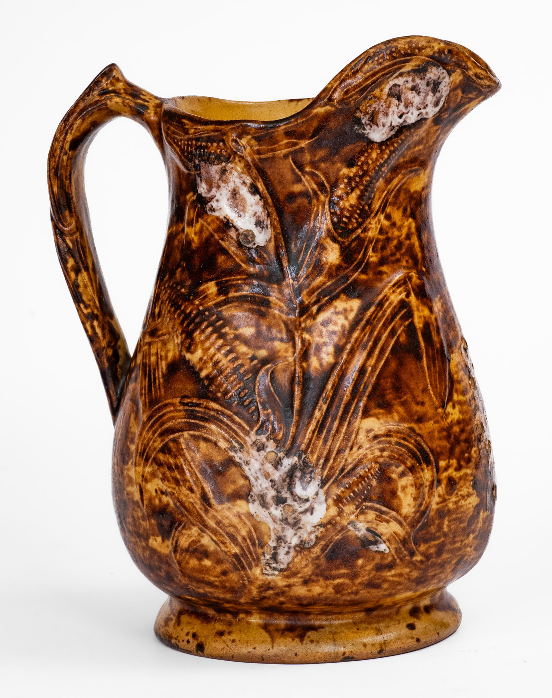 Exceptional Slip-Decorated Molded Stoneware Corn Pitcher, Stamped "S. RISLEY / NORWICH / 3," CT origin, circa 1850-1875. Outstanding glaze treatment. A related corn pattern pitcher, produced without the additional white and purplish-brown slip, resides in the collection of the Connecticut Historical Society. H 9 1/4".