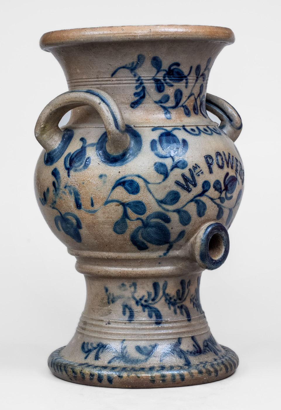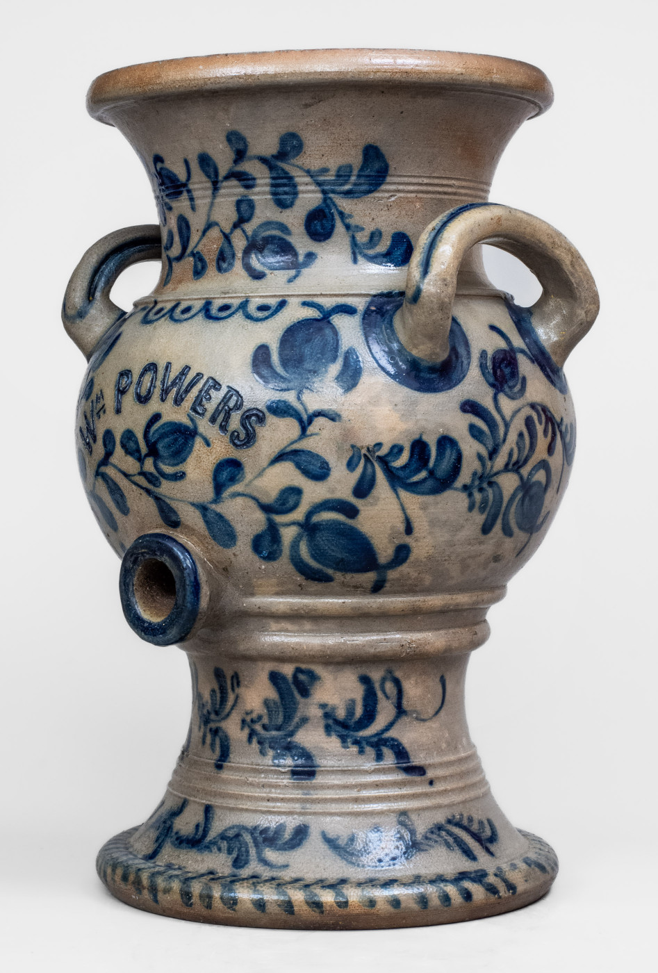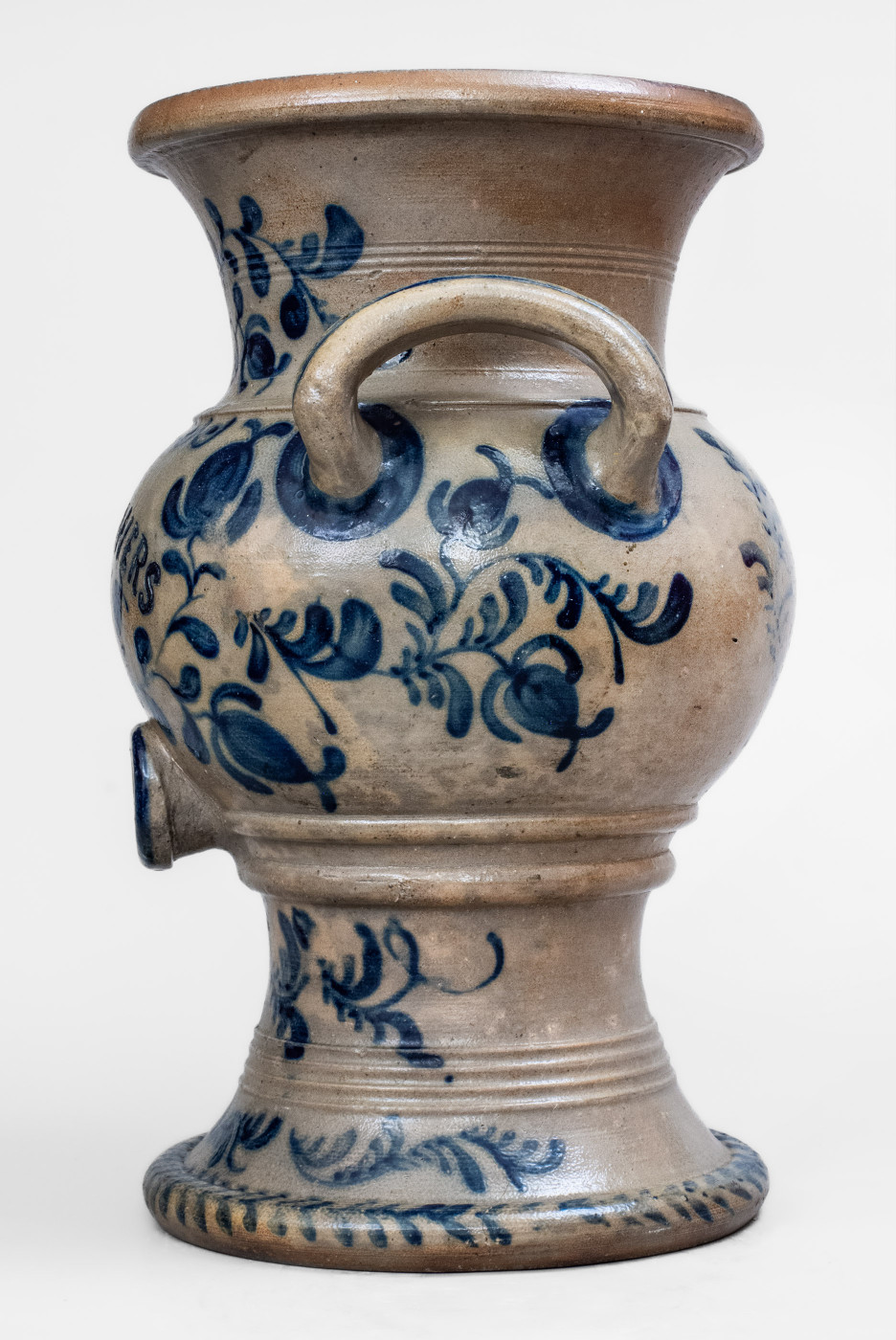 Pennsylvania Stoneware Masterwork. Highly Important Stoneware Pedestal-Based Presentation Water Cooler with Profuse Freehand Cobalt Decoration, Inscribed "WM. POWERS" and "J.H.," Stamped "J. HAMILTON / BEAVER," PA origin, circa 1845.