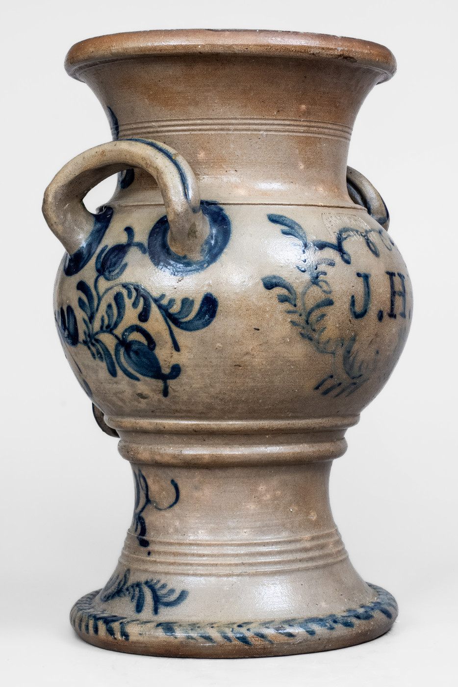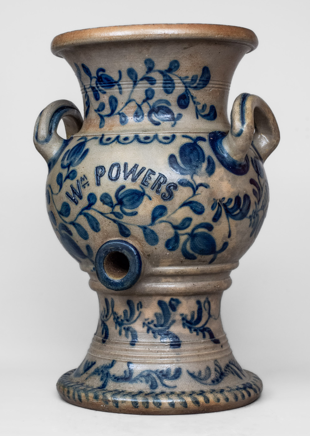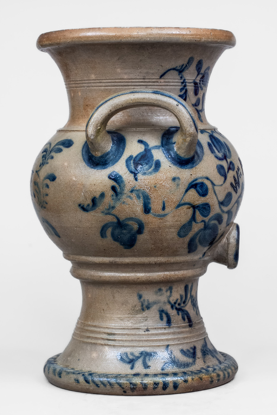 Pennsylvania Stoneware Masterwork. Highly Important Stoneware Pedestal-Based Presentation Water Cooler with Profuse Freehand Cobalt Decoration, Inscribed "WM. POWERS" and "J.H.," Stamped "J. HAMILTON / BEAVER," PA origin, circa 1845.