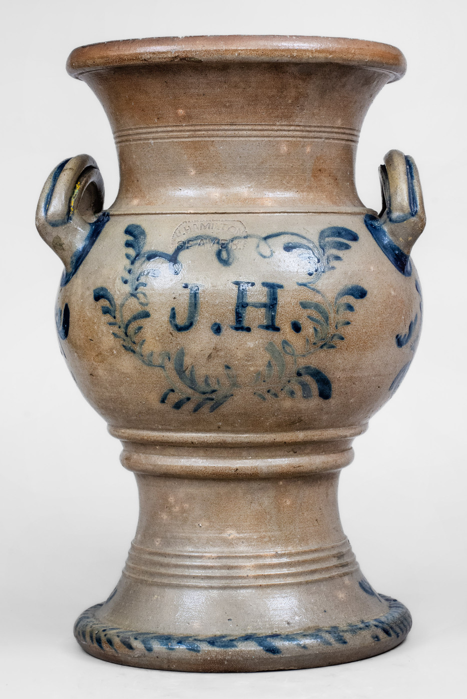 Among the most important and decorative examples of Western Pennsylvania stoneware to come to auction in decades, this work presents a young James Hamilton at his very best. The cooler's coveted pedestal-based form is amplified by an over-the-top beverage urn shape, uncharacteristic of the regional style, which showcases Hamilton's artistic abilities. The potter evidently took a level of pride in this work by inscribing his initials boldly on the reverse, a highly unusual treatment. The elaborate fuchsia vine motifs and drape motifs are traits that Hamilton would take with him to Greensboro, Pennsylvania circa 1850 and use for the next twenty-five years, influencing the work of other potters throughout the region.