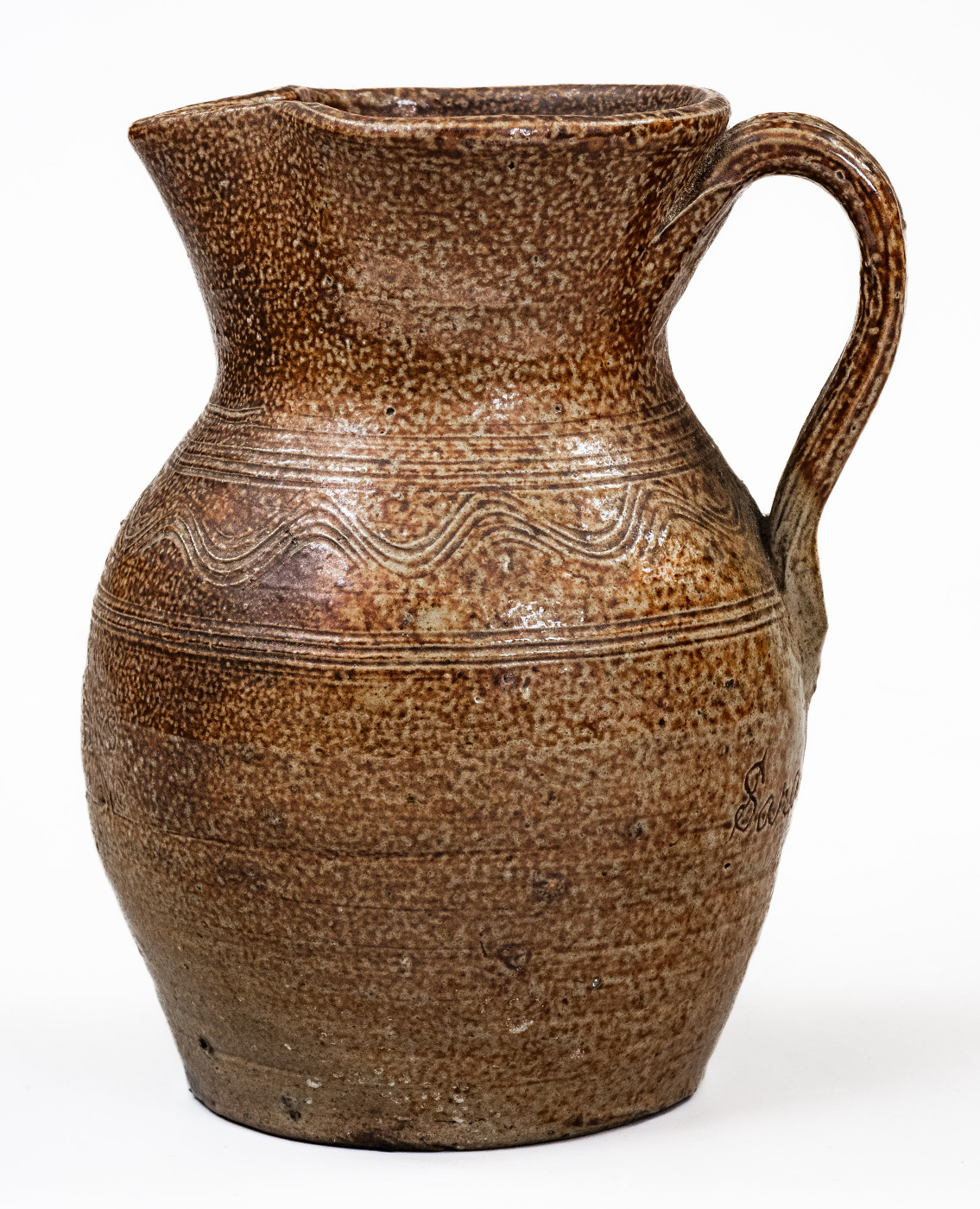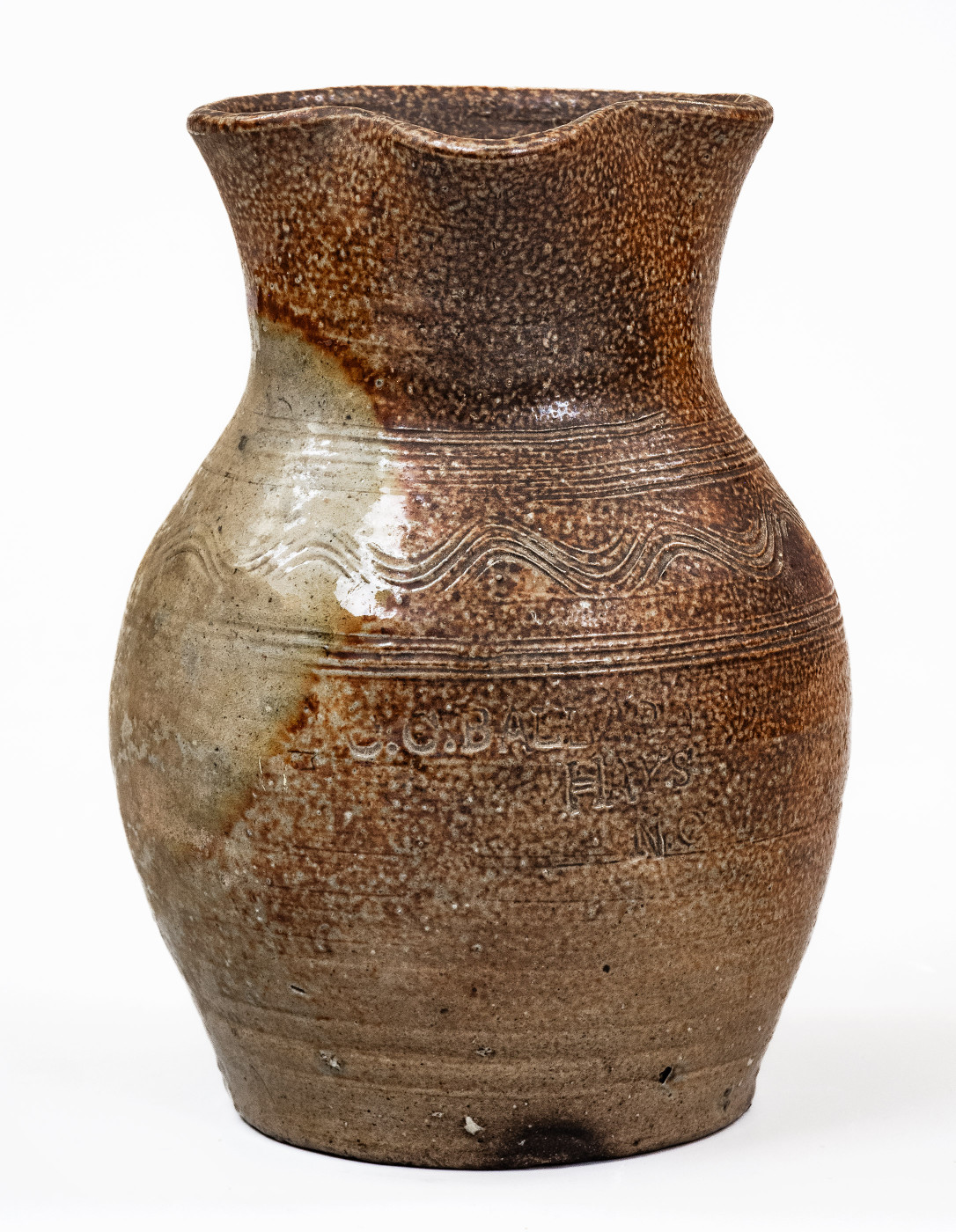 Very Rare Small-Sized Stoneware Presentation Pitcher, Inscribed "Sarah Owens / 1901," Stamped "C.C. BALLARD / HAYS / NC," Dated 1901. Only about 11 years old when this small pitcher was made, Sarah Owens appears in the 1900 federal census living only two households away from its maker, Cicero C. Ballard. An important new discovery in Wilkes County, NC stoneware. H 6 3/8".