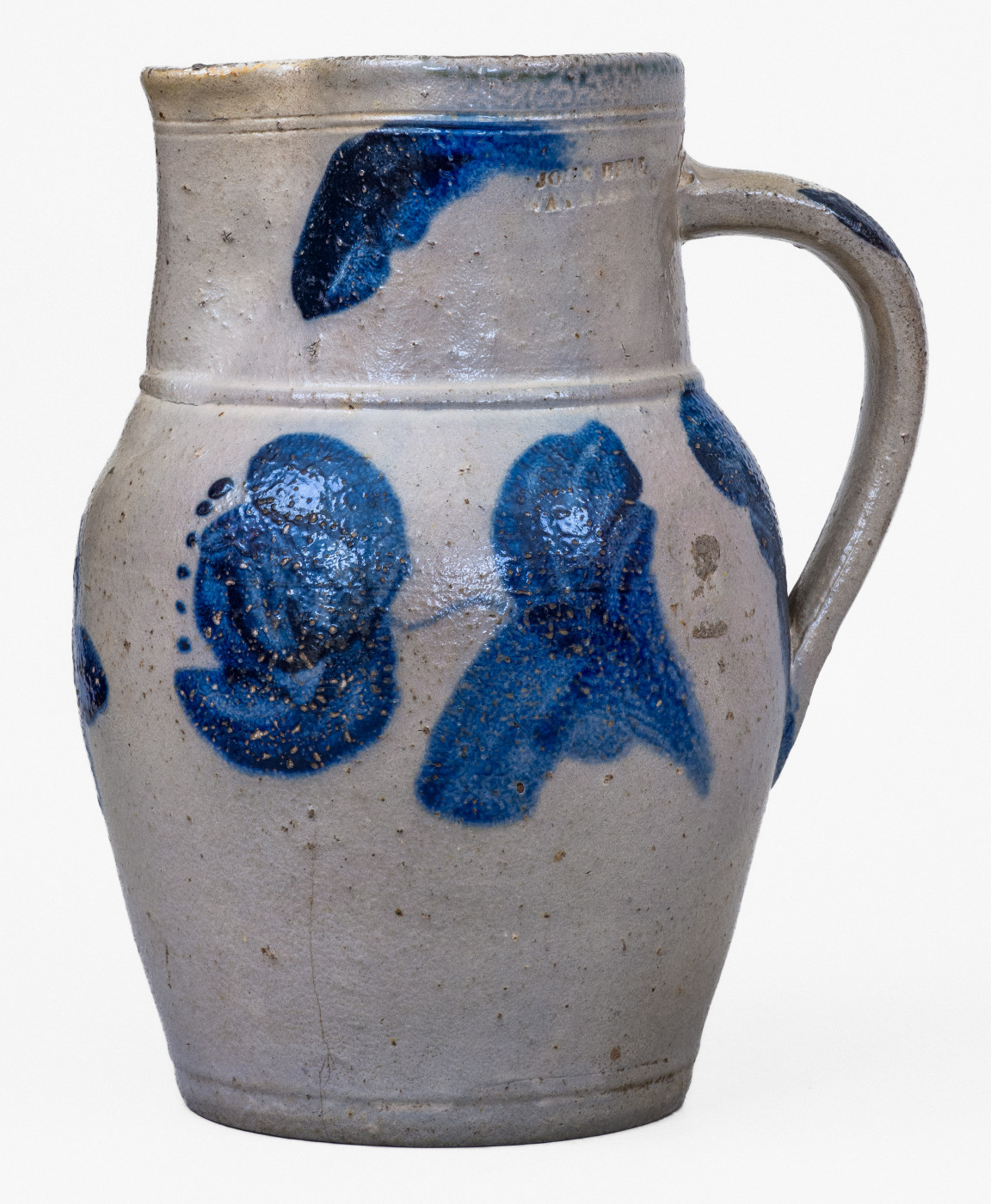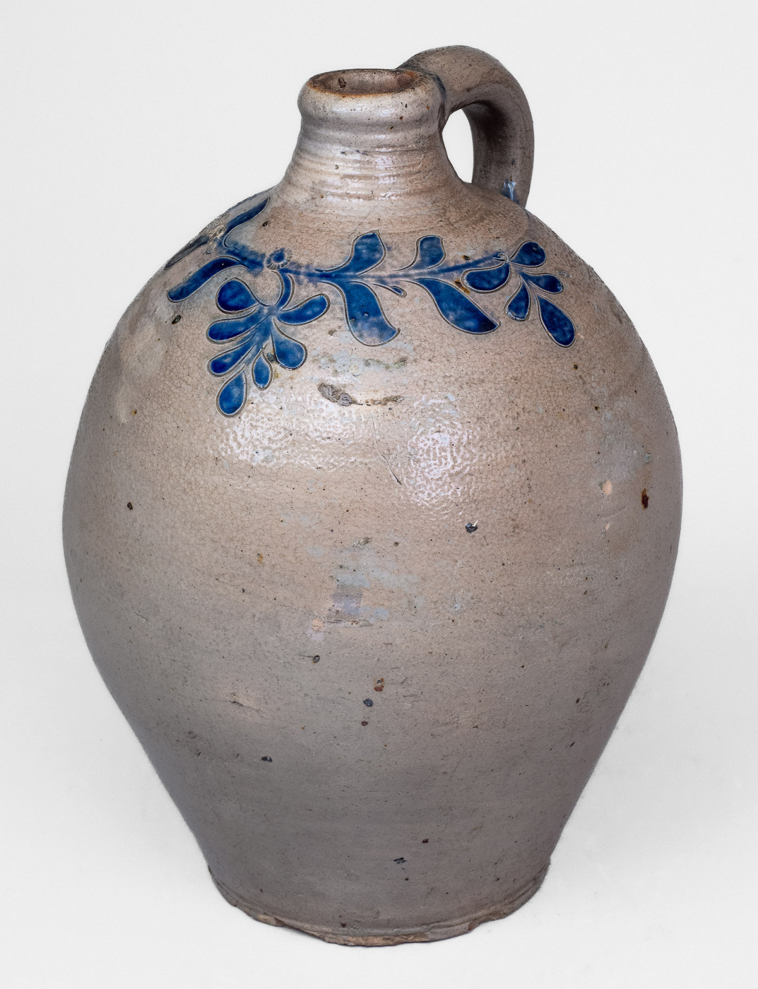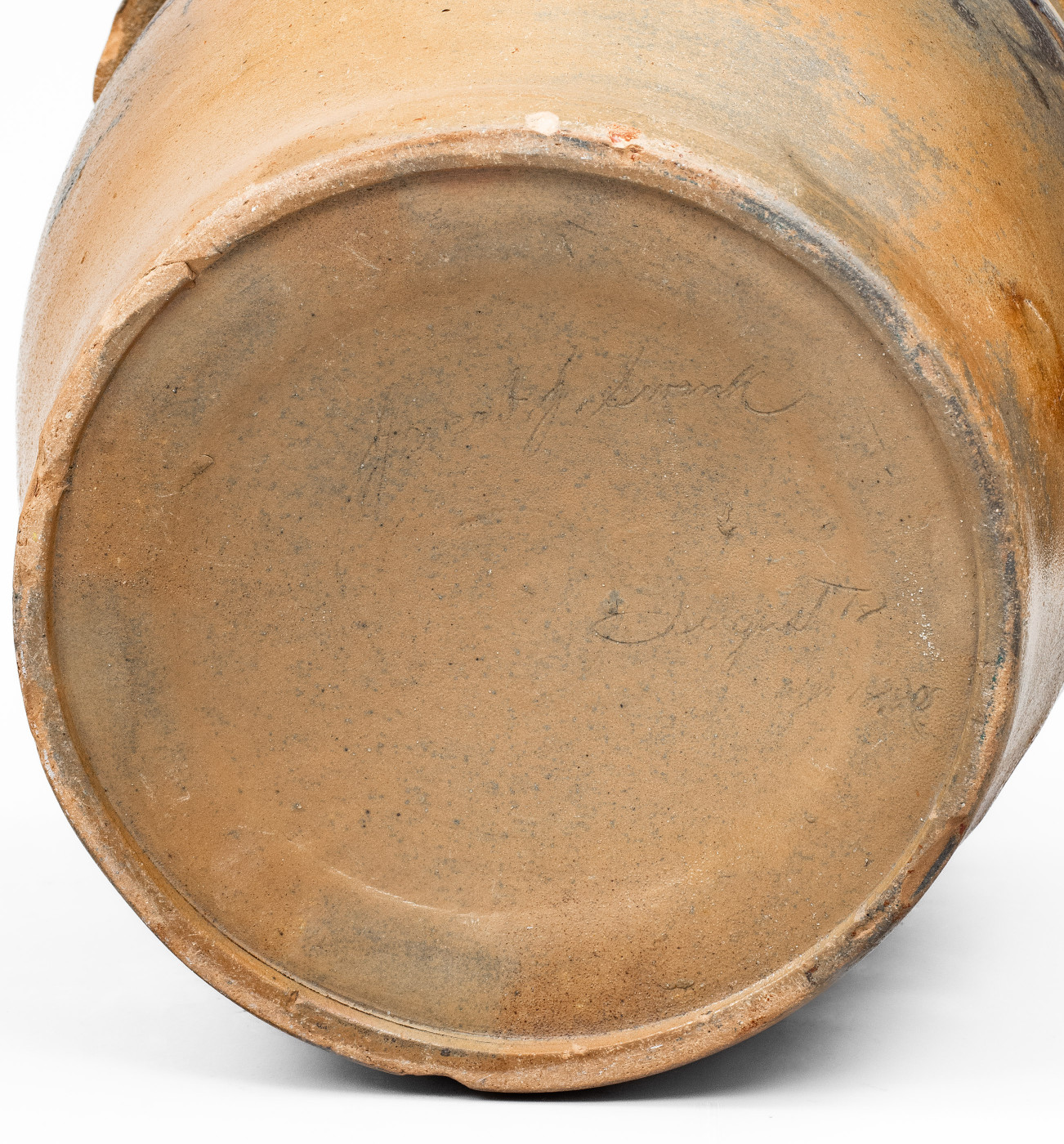 Featuring an exceptional size and desirable form, this work is the first example of stoneware bearing this mark that we have ever offered. Its form and decoration strongly suggest its maker was trained in Baltimore or elsewhere in the Mid-Atlantic region. H 14 3/4".