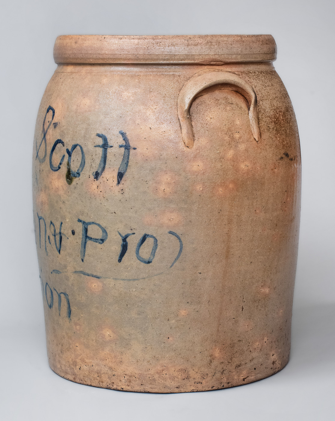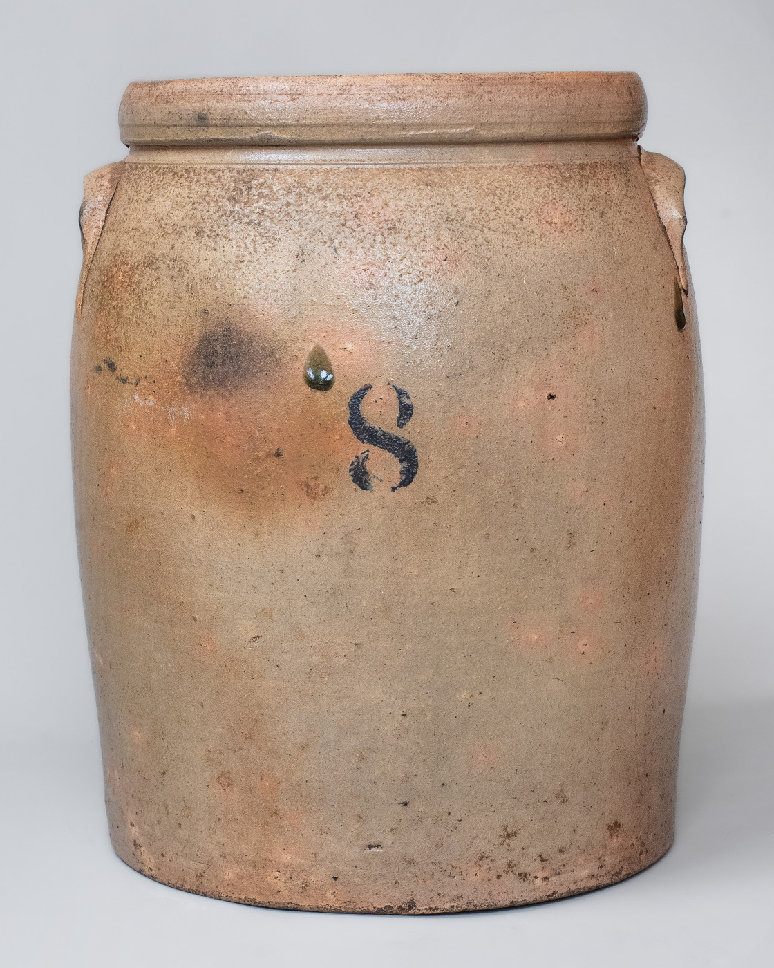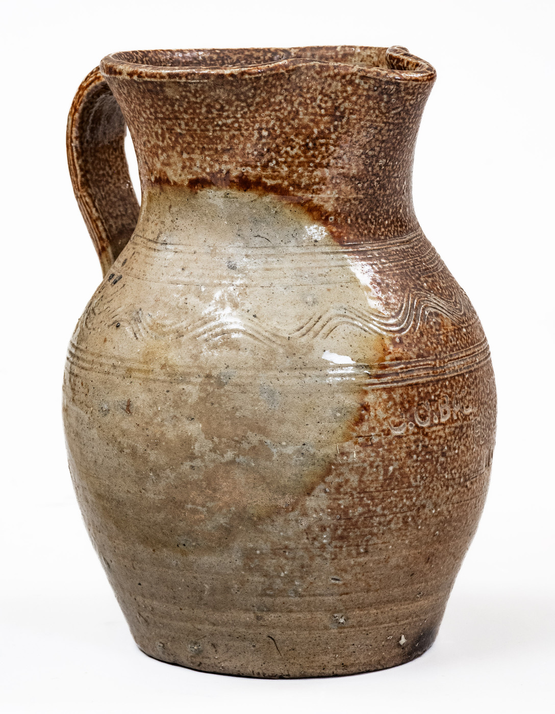 Featuring an exceptional size and desirable form, this work is the first example of stoneware bearing this mark that we have ever offered. Its form and decoration strongly suggest its maker was trained in Baltimore or elsewhere in the Mid-Atlantic region. H 14 3/4".