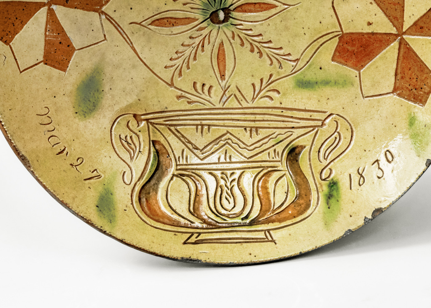 This plate is attributed to Monday based upon the similarity of several aspects of the pattern design and execution of its sgraffito decoration to one signed example in the collection of the Philadelphia Museum of Art. Each features a thick, opaque white slip ground, which was removed in areas, such as the panels of the pinwheel devices, stylized tulips, and urn, to reveal the red clay body underneath, The carving tool consistently left 1/8-inch wide, flat, shallow blade scars in the clay which are visible through the clear lead glaze. Monday also seems to have used a thinly edged coggle wheel to score in the slightly scalloped, segmented lines forming the stems and outlines of flowers. The stems of these flower designs also incorporate a slight, hollow swell near the flower blossom. The form of tulip seen on this example, with long, thinly carved petals of two different lengths and coggled outlines enclosing a green center with an elongated, feathered stamen, is also characteristic of his sgraffito patterns. A number of other potters and apprentices worked with Monday in the pottery, including both his sons, Edmund and David, and German immigrant potters Mathias Myer and Charles Moritz. Consequently, we may never truly know the specific primary hands involved in the making of individual examples, even when they bear the signature of the master potter. –J.L.L.