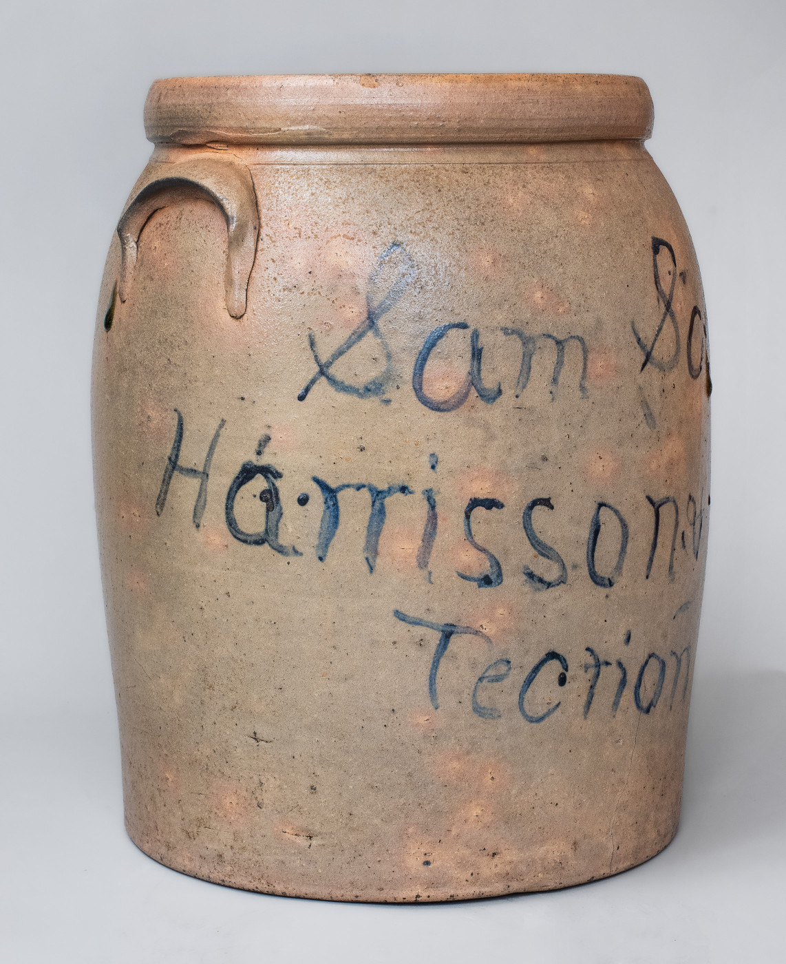 Rare Eight-Gallon Stoneware Political Jar with Cobalt Inscription, "Sam Scott / Harrisson(sic) & Pro / Tection," OH origin, circa 1890. This jar references the 23rd U.S. President, Benjamin Harrison, who served from 1889 to 1893, and his staunch support of protective tariffs, designed to benefit domestic manufacturers and workers. Among these was the McKinley Tariff, framed by then-Representative, William McKinely, which became law on October 1, 1890. H 17".