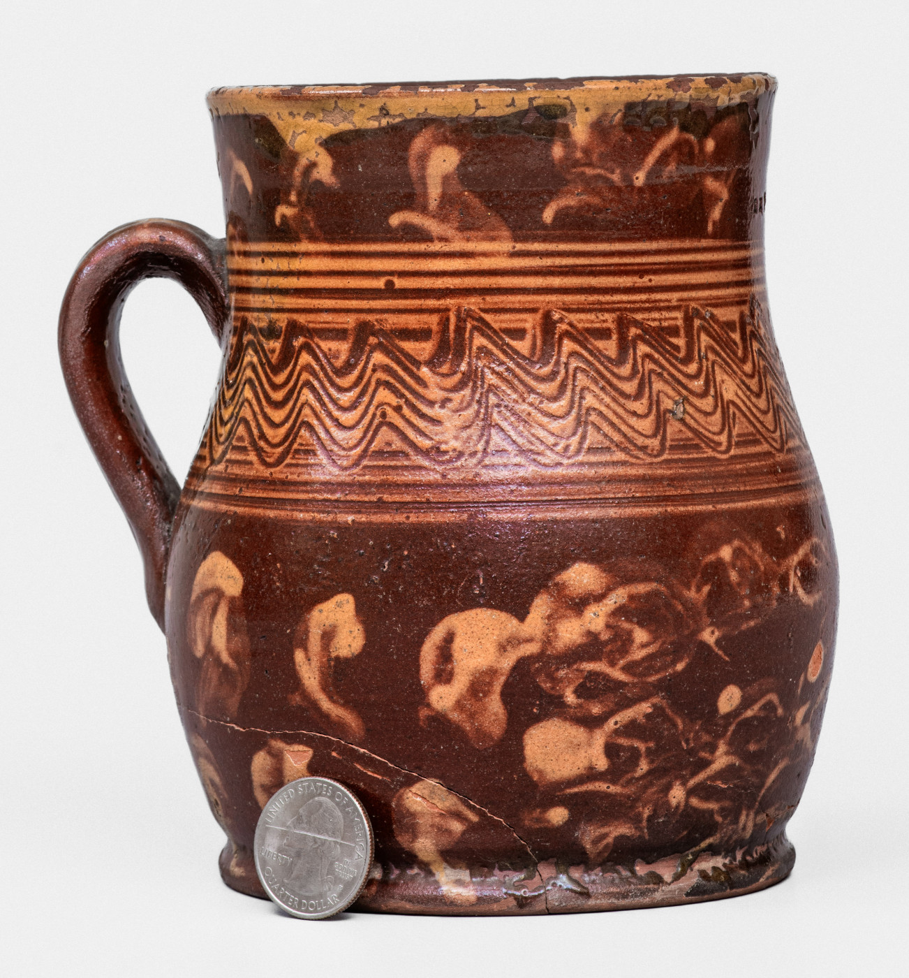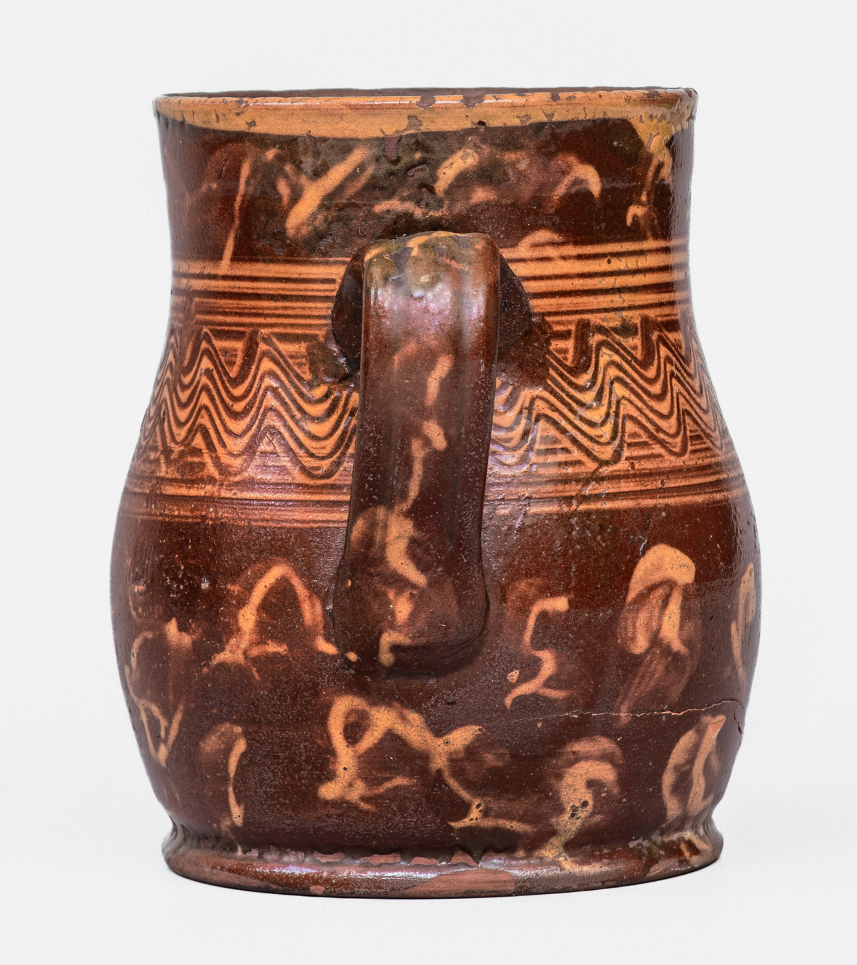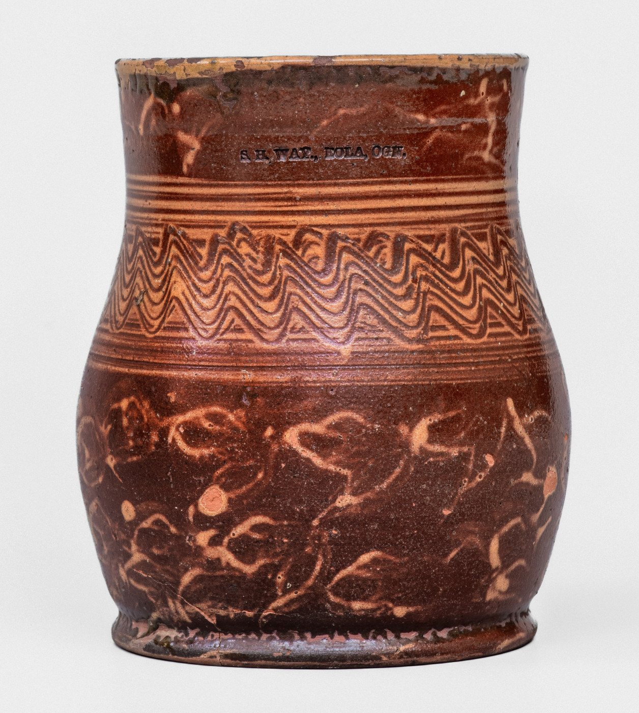 Extremely Rare Slip-Decorated Redware Ale Mug, Stamped "S. H. WAY., EOLA, OGN.," Solomon Hiatt Way, Eloa, Polk County, Oregon, origin, circa 1860's. Height 5 3/4".