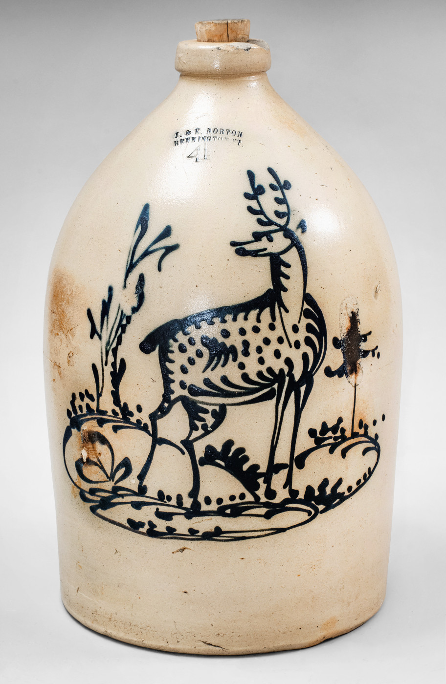 Rare and Fine Four-Gallon Stoneware Jug with Cobalt Deer Scene, Stamped "J. & E. NORTON / BENNINGTON, VT," circa 1855. This jug's excellent size, large-scale design, and superb color/contrast, make it a noteworthy example of an iconic American stoneware image. Provenance: Waasdorp American Pottery Auction, March 15, 2008, lot 120, illustrated on catalog cover. H 18 1/4".