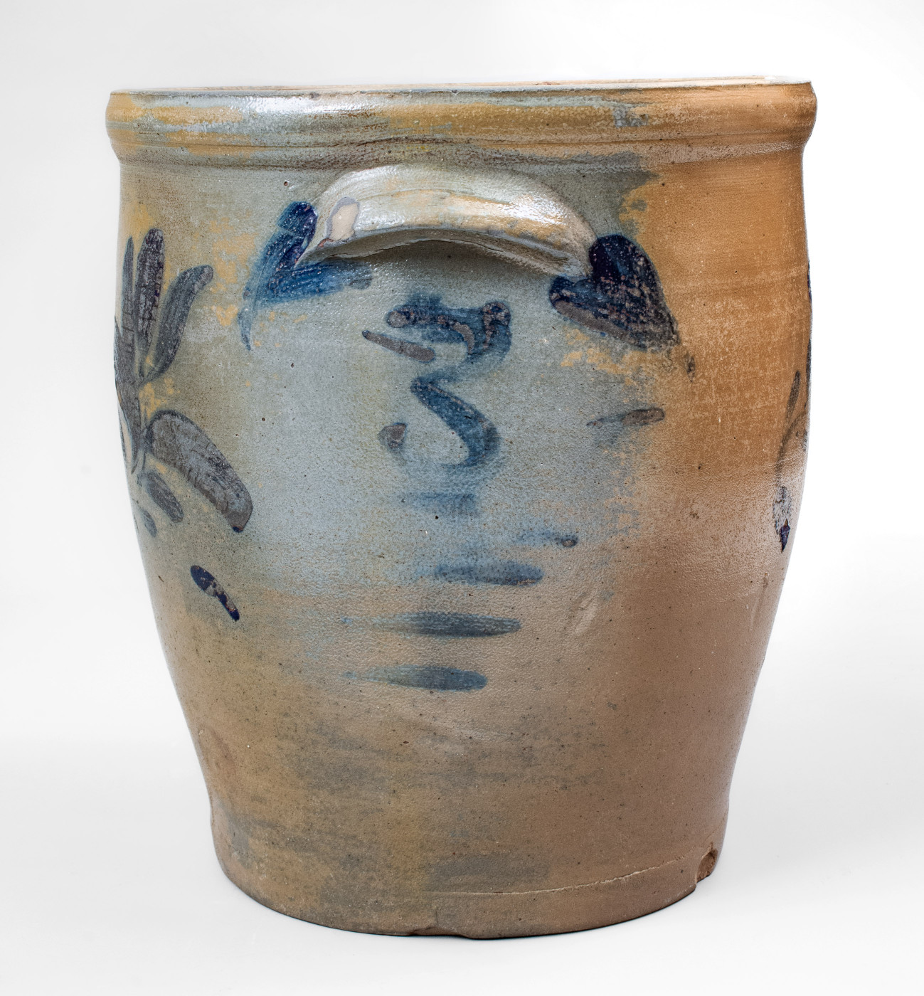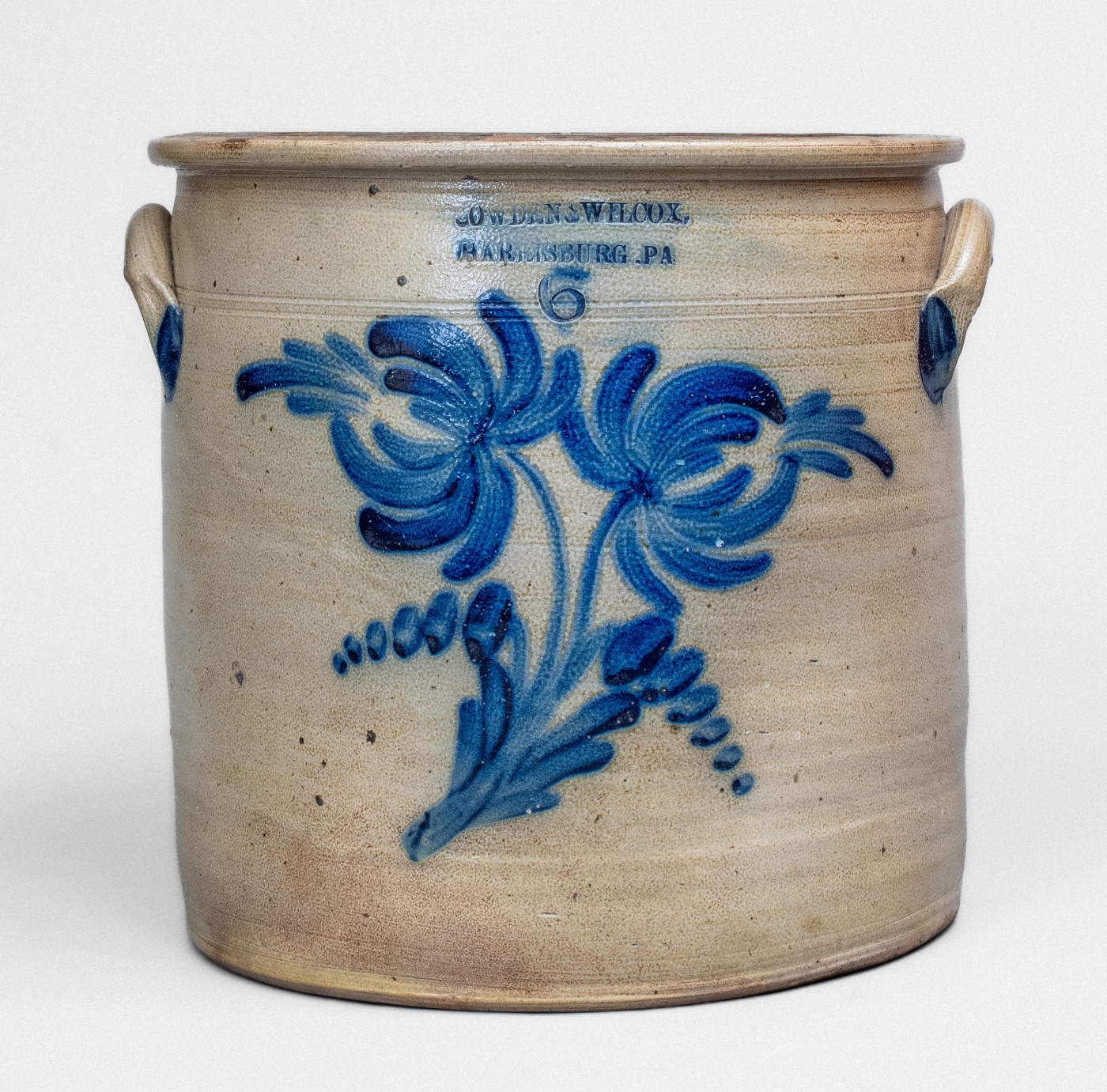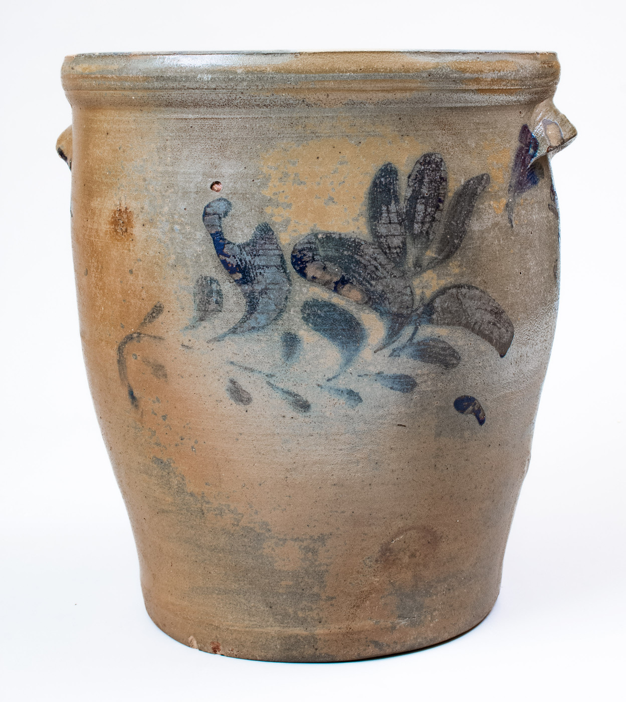 Fine Six-Gallon Stoneware Crock with Elaborate Cobalt Floral Decoration, Stamped "COWDEN & WILCOX, / HARRISBURG .PA," circa 1865. Provenance: Recently found in a Northumberland County, PA home. H 12 3/4".
