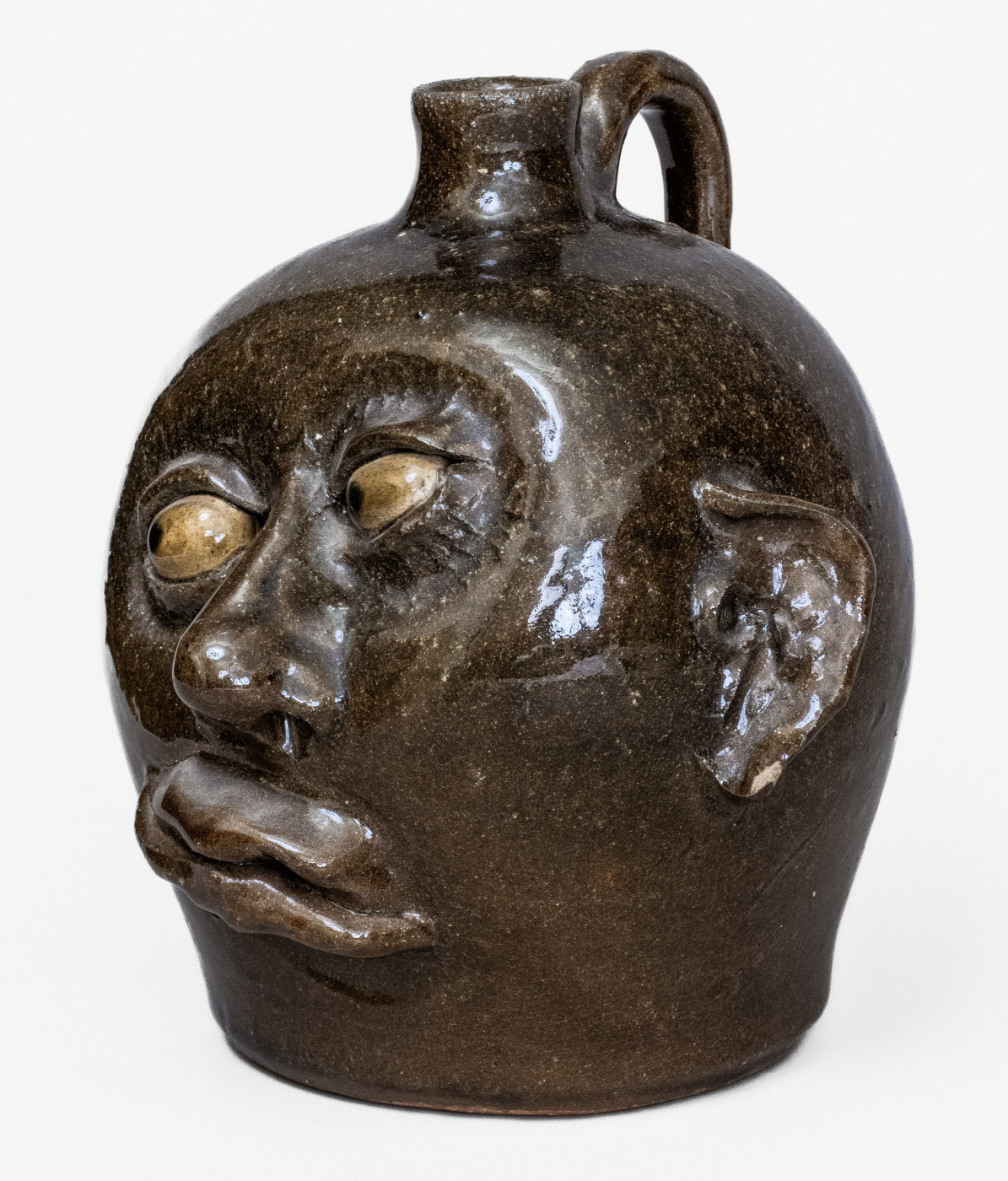 Fine Early-Period Alkaline-Glazed Stoneware Face Jug, Signed "Lanier Meaders," Cleveland, GA origin, circa 1970. Aspects of the modeling on this jug, including the glazed eyes and omission of teeth, indicate it is a relatively early example of Meaders's work. H 9 1/4".