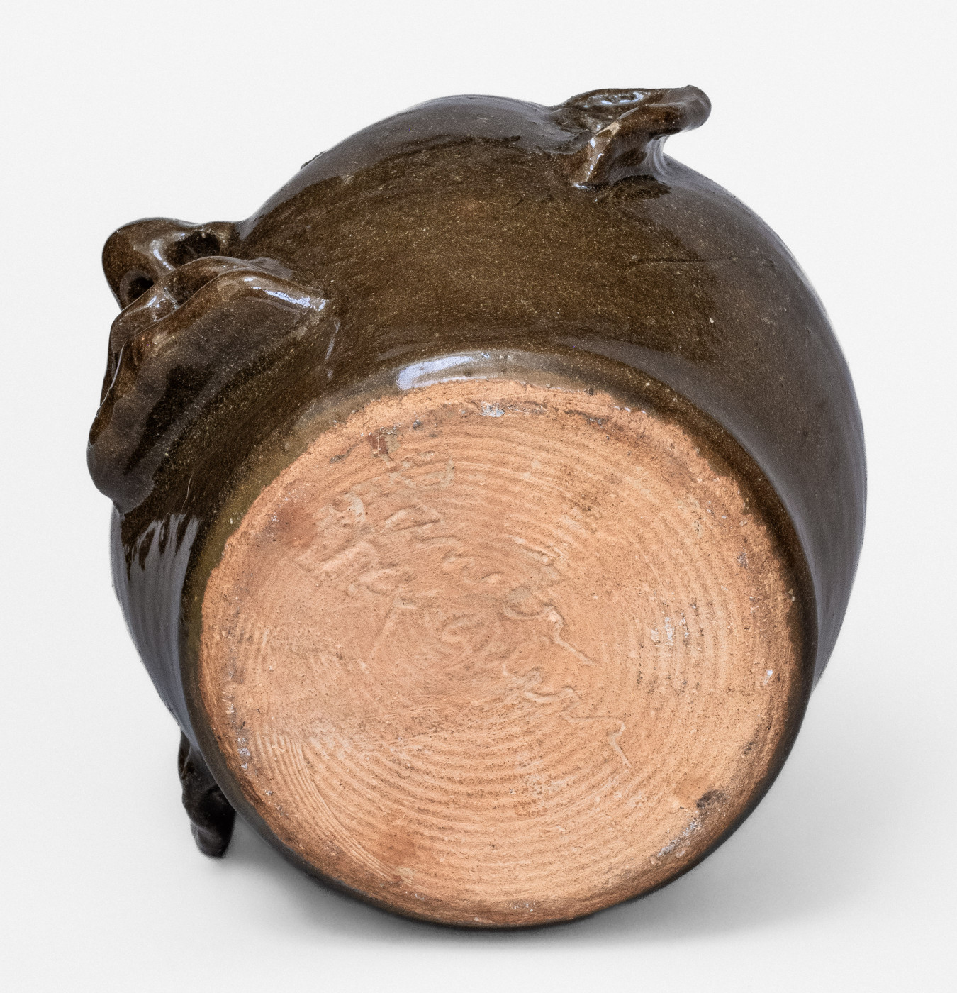Extremely Rare Handled Tanware Bank, New Geneva or Greensboro, PA origin, circa 1885. Among the most imaginatively-crafted examples of Western Pennsylvania tanware that we have seen, potted in a highly desirable bank form. H 7 1/4".