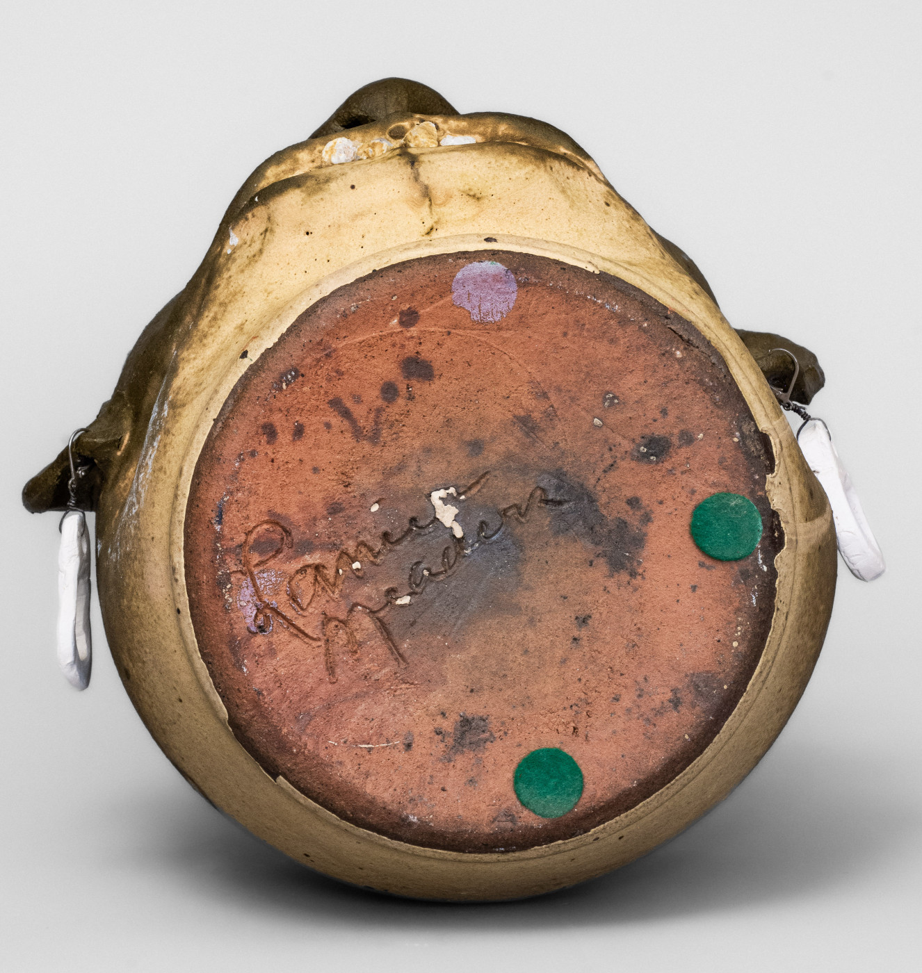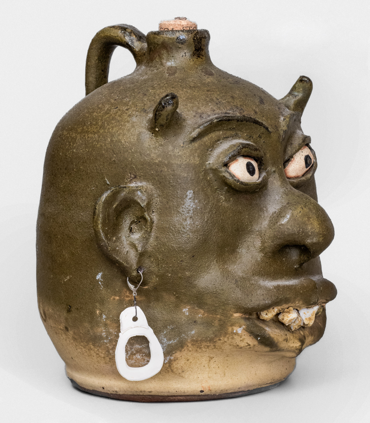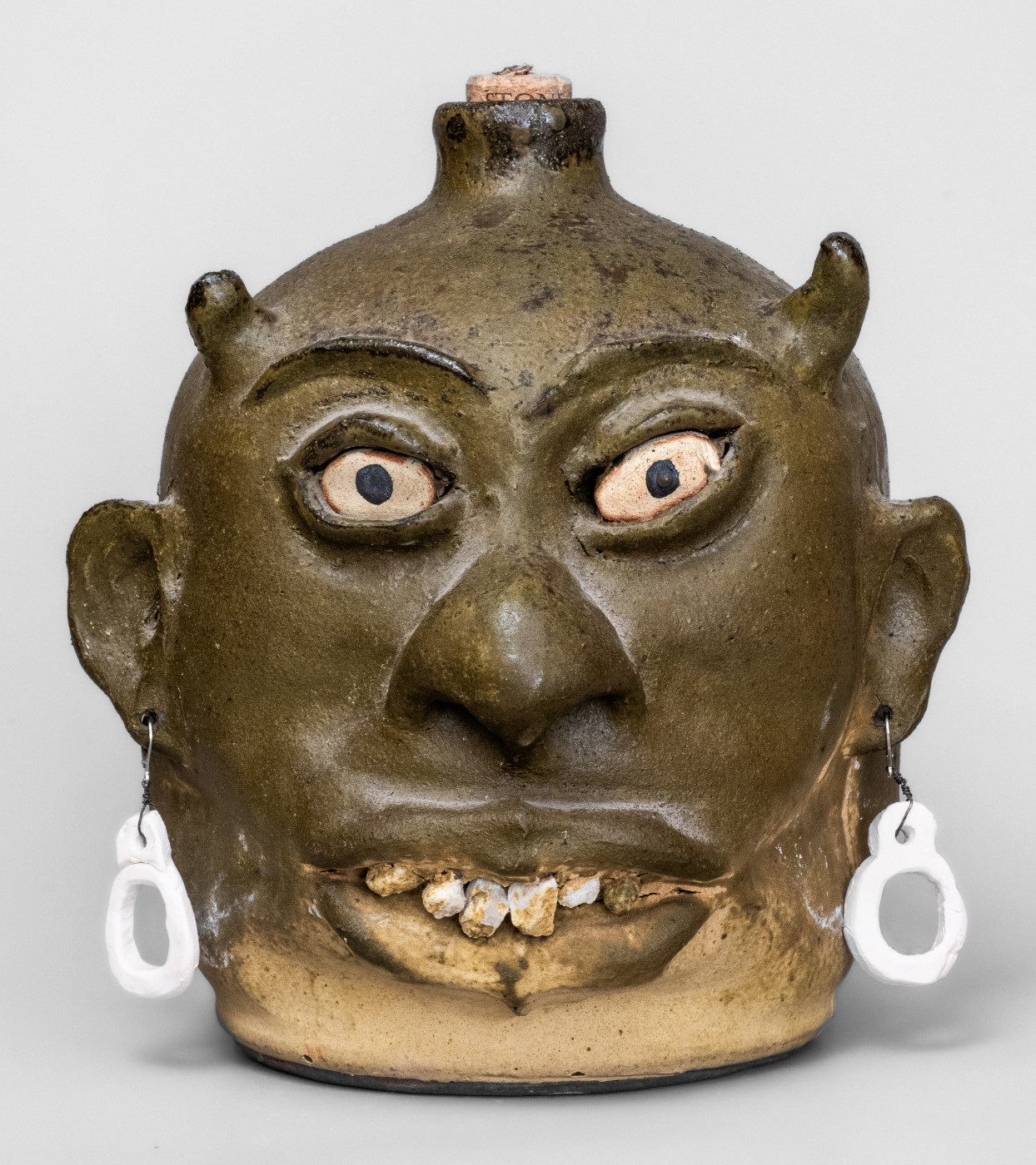 Rare Alkaline-Glazed Stoneware Devil Face Jug, Signed "Lanier Meaders," Cleveland, GA origin, circa 1970. A prized and rarely-produced Meaders face vessel form, this devil jug features modeling, glaze, and rock teeth application all dating it to a relatively early period in this potter's production. The ear's original piercings include later fired clay and wire earrings made by Billy Meaders. H 9 3/8".