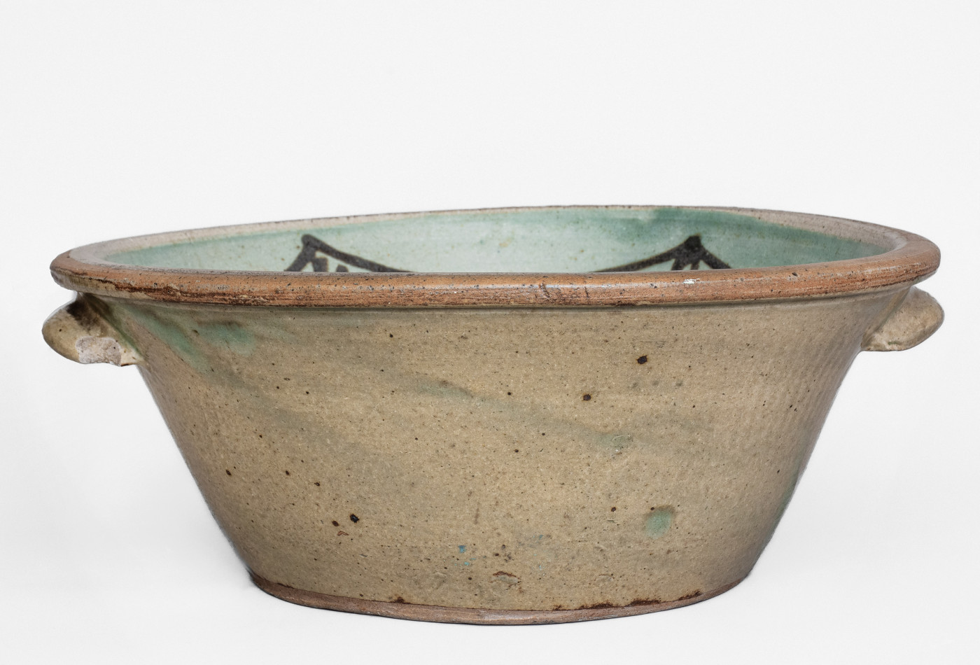 Very Rare One-and-a-Half-Gallon Stoneware Bowl with Cobalt Man-in-the-Moon Decoration, Stamped "COWDEN & WILCOX / HARRISBURG, PA," circa 1865. Provenance: James Chebalo Collection. Diam. 11 3/8" ; H 5 1/2".