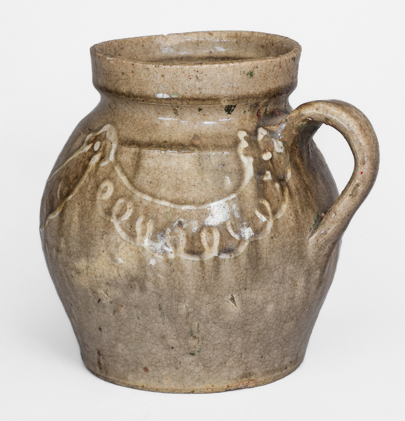 Fine Alkaline-Glazed Stoneware Handled Jar with Kaolin Slip Decoration, attributed to Collin Rhodes, Shaw's Creek, Edgefield District, SC, circa 1850. Provenance: From a fifty-year SC collection. H 7 1/4".