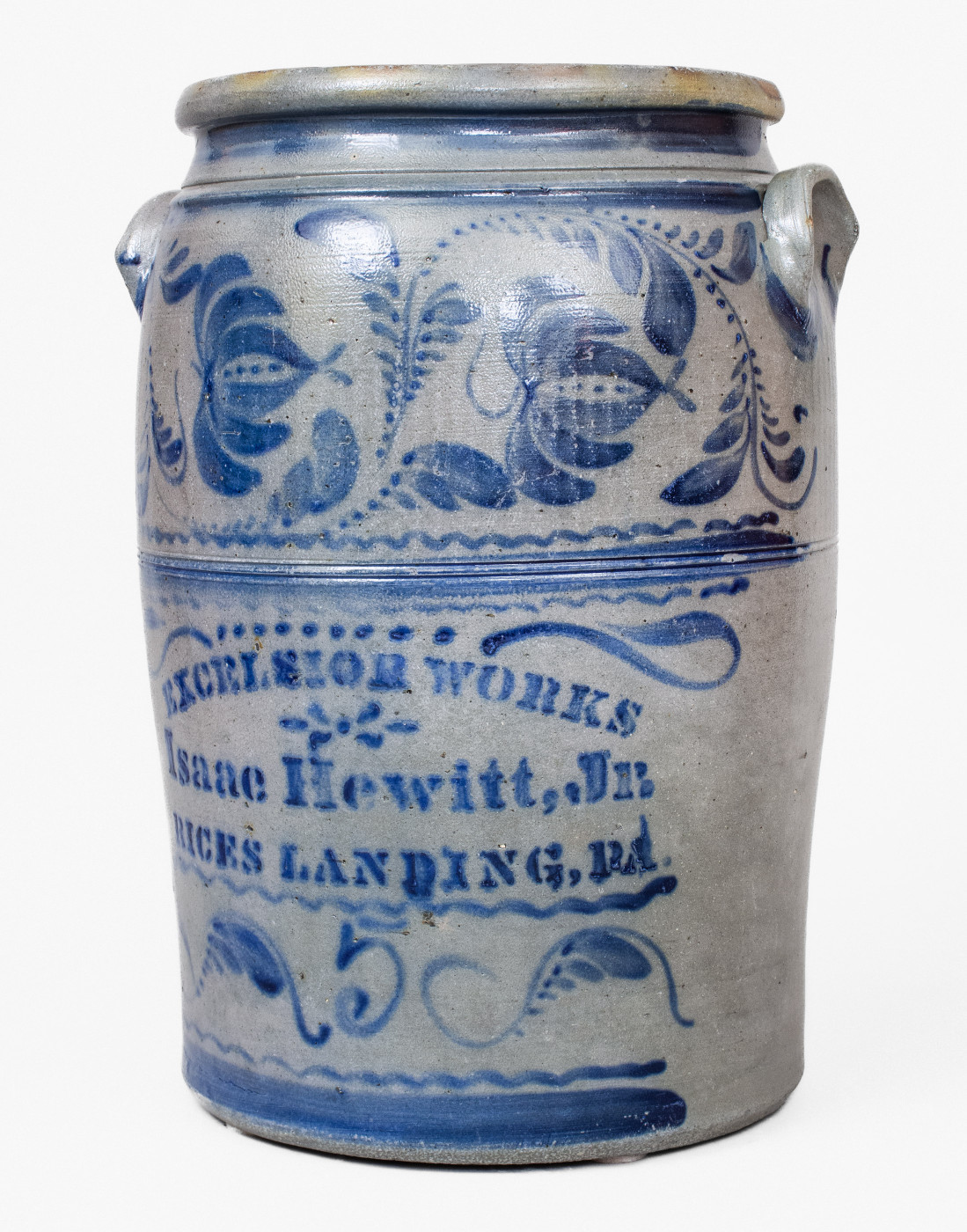 Exceptional Five-Gallon Stoneware Jar with Elaborate Freehand Cobalt Decoration, Stenciled "EXCELSIOR WORKS / Isaac Hewitt, Jr. / RICES LANDING, PA.," circa 1875. Featuring outstanding top-to-bottom freehand and stenciled decoration, this jar is among the finest examples of Hewitt's work that we have offered. H 15 3/4".