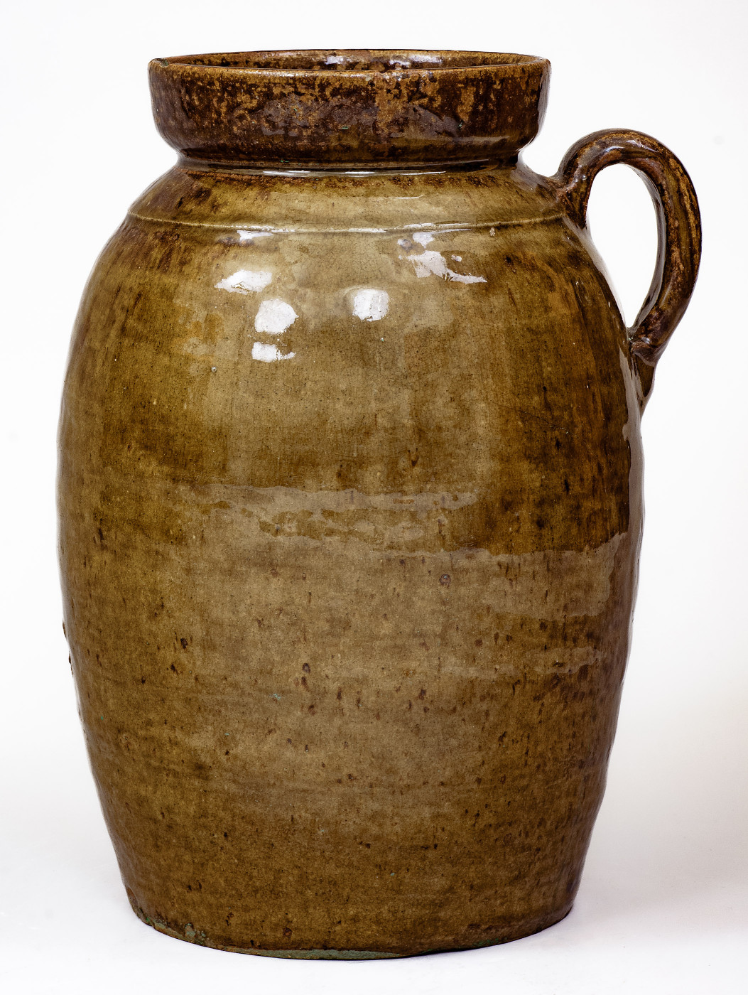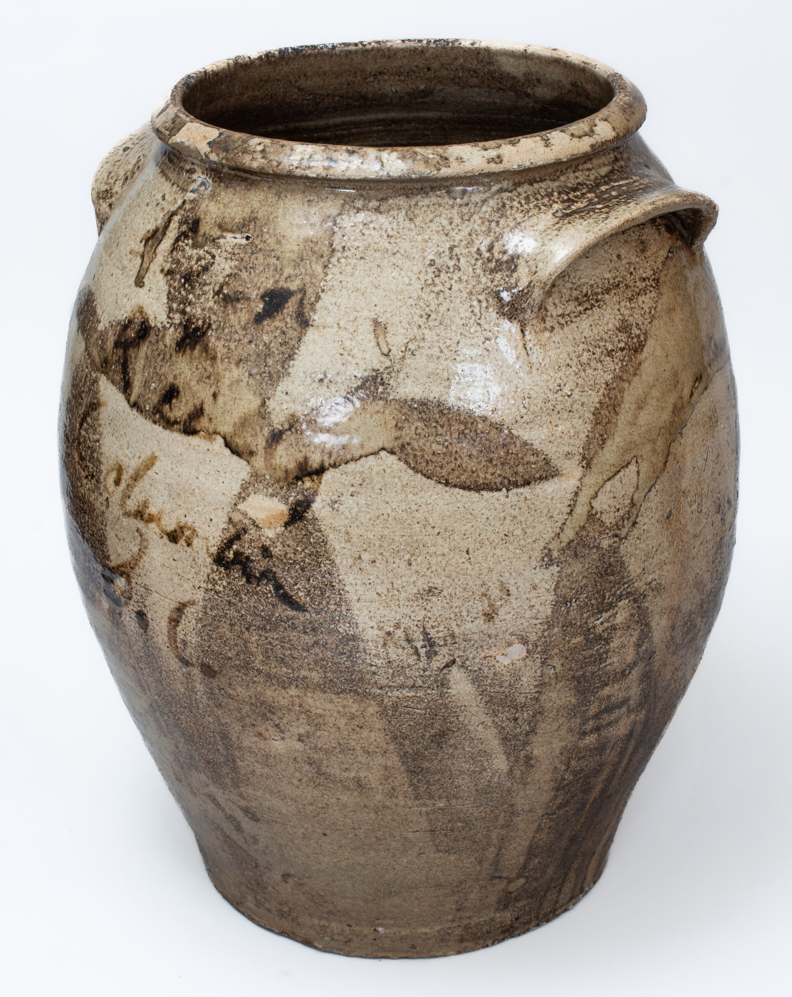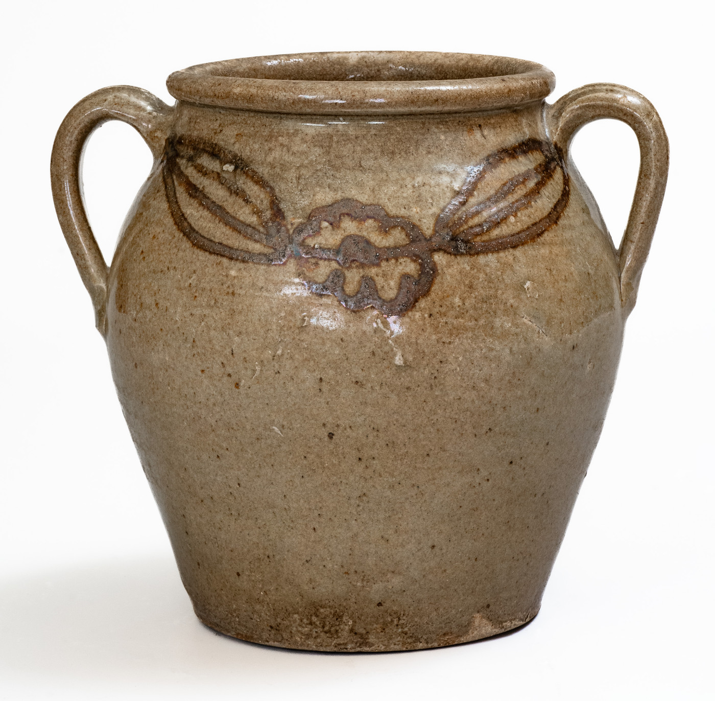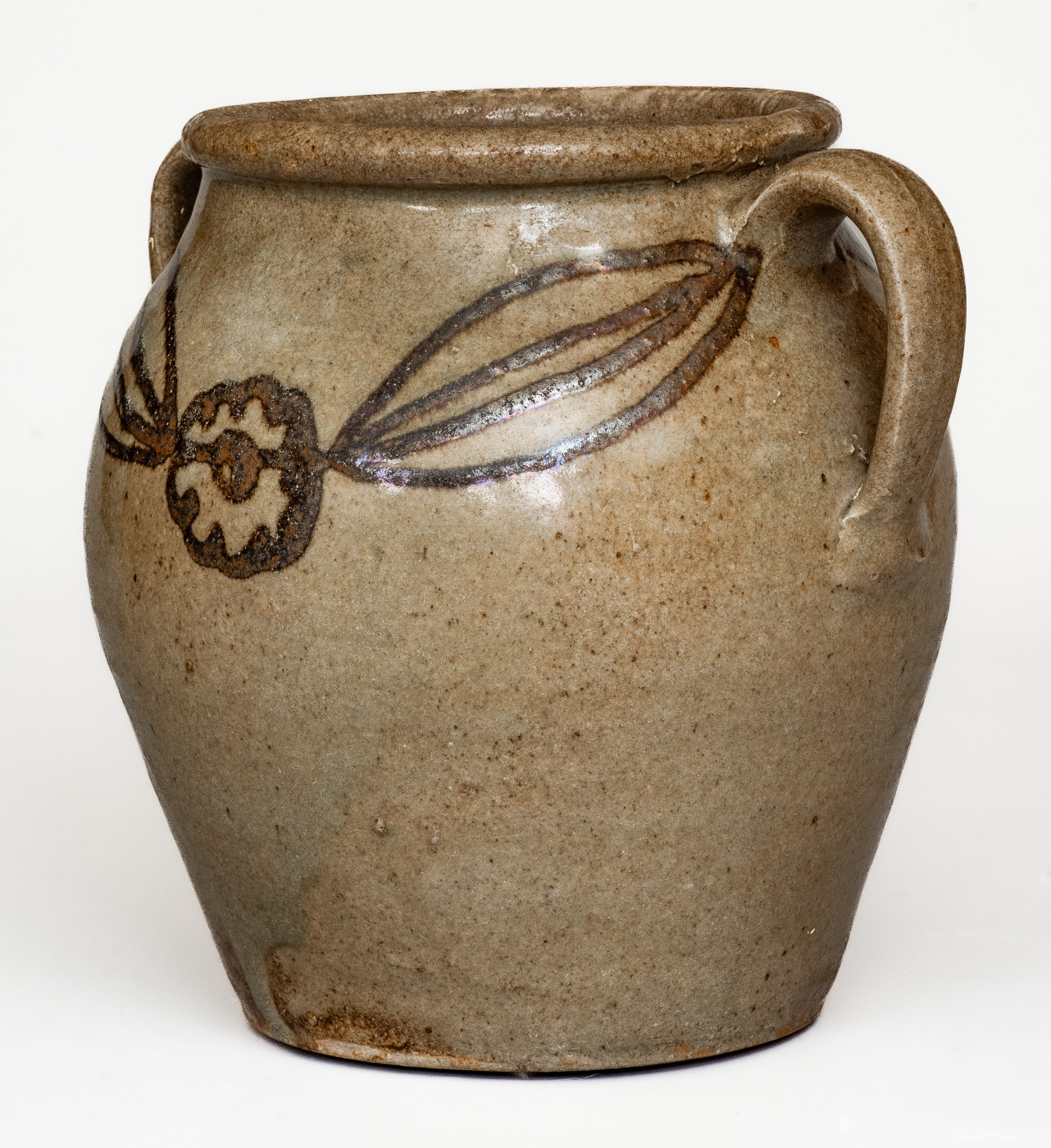 Very Rare Open-Handled Alkaline-Glazed Stoneware Jar with Iron Slip Floral Decoration, attributed to Phoenix Factory, Shaw's Creek, Edgefield District, SC, circa 1840. Desirable form and highly unusual striped leaf designs incorporated into the classic Chandler-type daisy motif. Provenance: From a fifty-year SC collection. H 8 3/4".