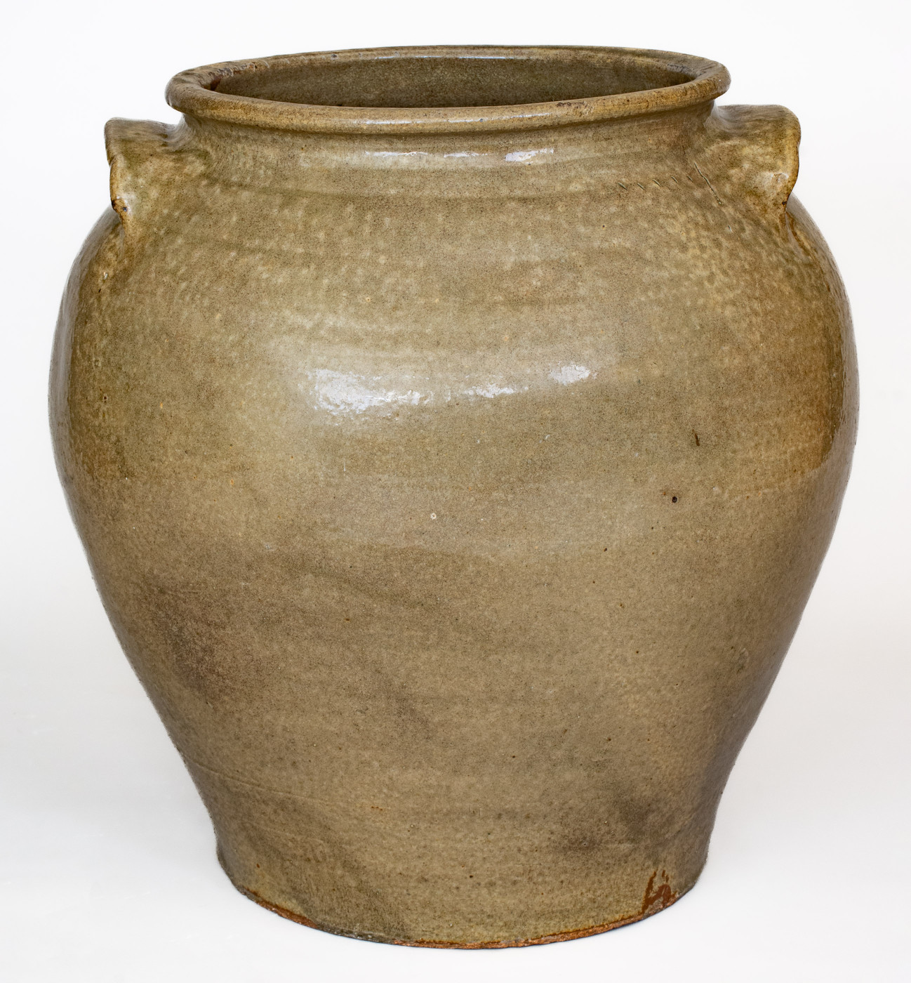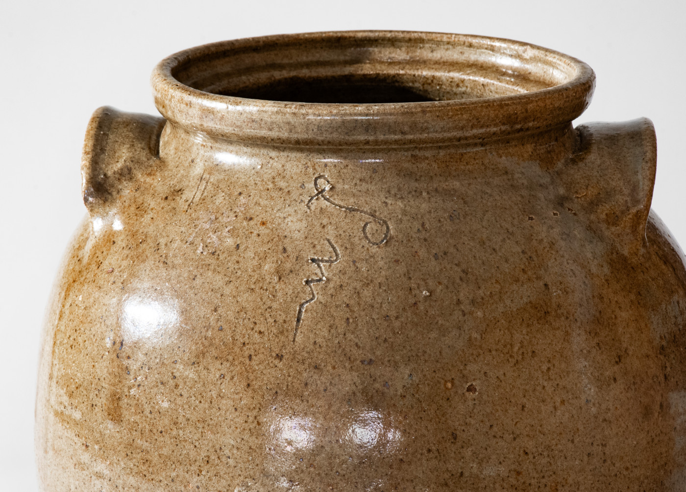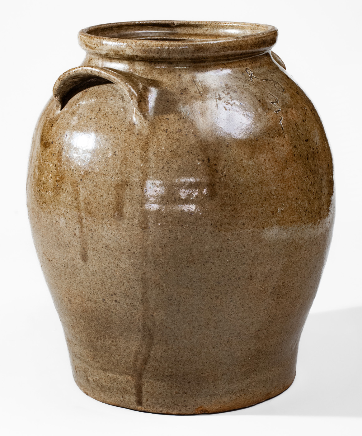 The jar offered in this auction expands our understanding of an important figure in the story of Edgefield stoneware, building on a small but growing body of this potter's work and helping to identify his own distinctive style. This example displays what can be dubbed Harry traits in its flattened rim and handles. It also showcases his high level of proficiency as a potter in its thin-walled construction and stately, swell-bodied form, including an impressive circumference of 46 1/2 inches. Of interesting note, the jar was produced the same year as David Drake's iconic "Catination" jar. According to Goldberg and Witkowski's Ceramics in America 2012 article, "Beneath His Magic Touch: The Dated Vessels of the African-American Slave Potter Dave," the year, 1836, saw possible growth in the number of dated vessels Drake was producing; eight are documented as of the writing of  the article, two of which included poems. Perhaps Harry's jar is further evidence of some sort of change at Pottersville during this year or emblematic of artistic influence between these two potters. At any rate, the discovery of a third Harry jar with incised inscription suggests that he may have actually inscribed his work with some frequency, and further highlights that Drake was not unique in this regard. Provenance: From a fifty-year SC collection. H 15" ; Diam. (at rim) 10" ; Circum. 46 1/2".
