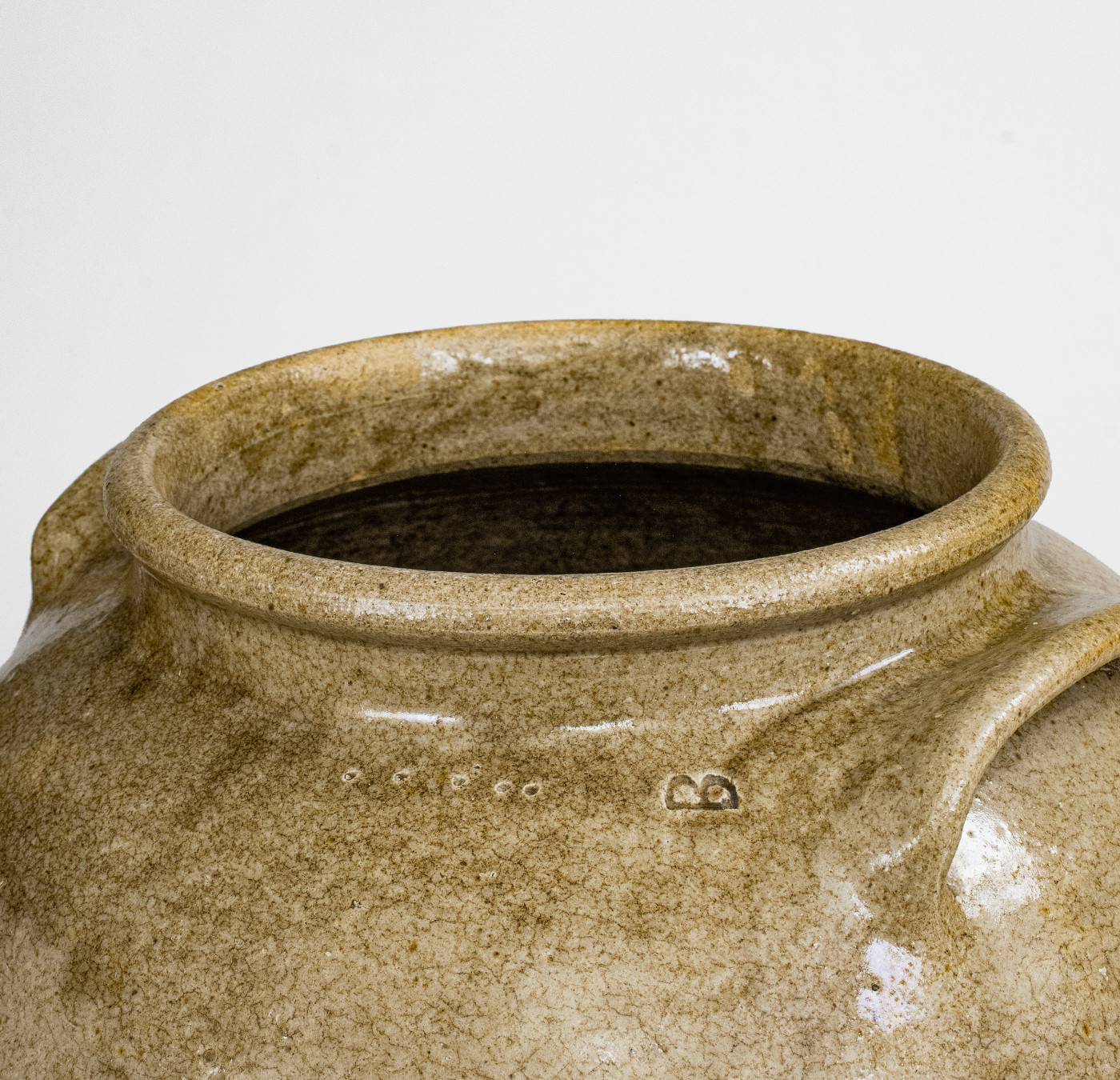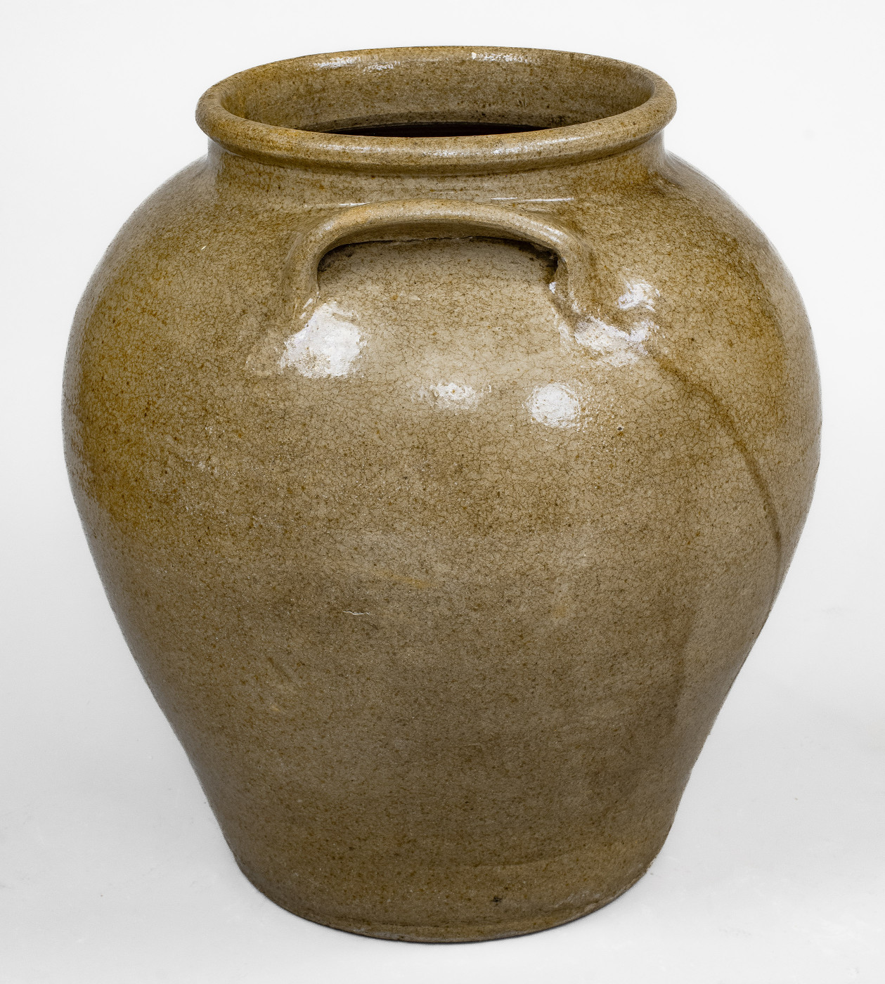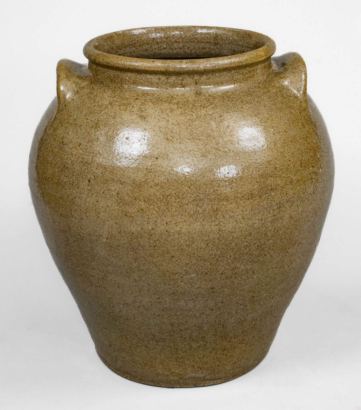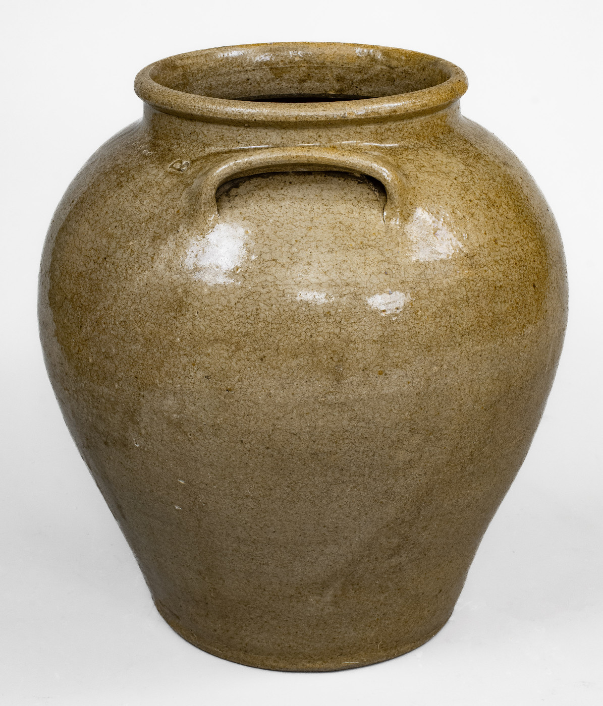 The jar offered in this auction expands our understanding of an important figure in the story of Edgefield stoneware, building on a small but growing body of this potter's work and helping to identify his own distinctive style. This example displays what can be dubbed Harry traits in its flattened rim and handles. It also showcases his high level of proficiency as a potter in its thin-walled construction and stately, swell-bodied form, including an impressive circumference of 46 1/2 inches. Of interesting note, the jar was produced the same year as David Drake's iconic "Catination" jar. According to Goldberg and Witkowski's Ceramics in America 2012 article, "Beneath His Magic Touch: The Dated Vessels of the African-American Slave Potter Dave," the year, 1836, saw possible growth in the number of dated vessels Drake was producing; eight are documented as of the writing of  the article, two of which included poems. Perhaps Harry's jar is further evidence of some sort of change at Pottersville during this year or emblematic of artistic influence between these two potters. At any rate, the discovery of a third Harry jar with incised inscription suggests that he may have actually inscribed his work with some frequency, and further highlights that Drake was not unique in this regard. Provenance: From a fifty-year SC collection. H 15" ; Diam. (at rim) 10" ; Circum. 46 1/2".