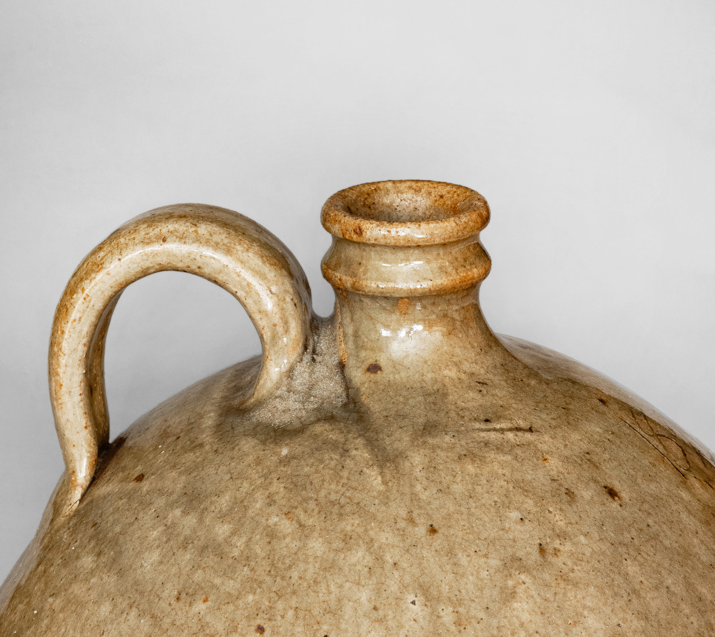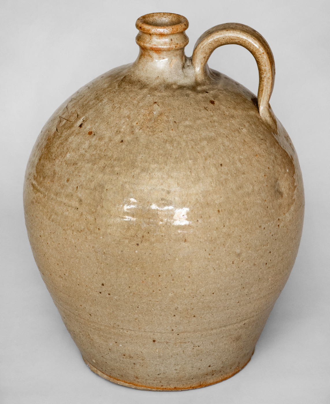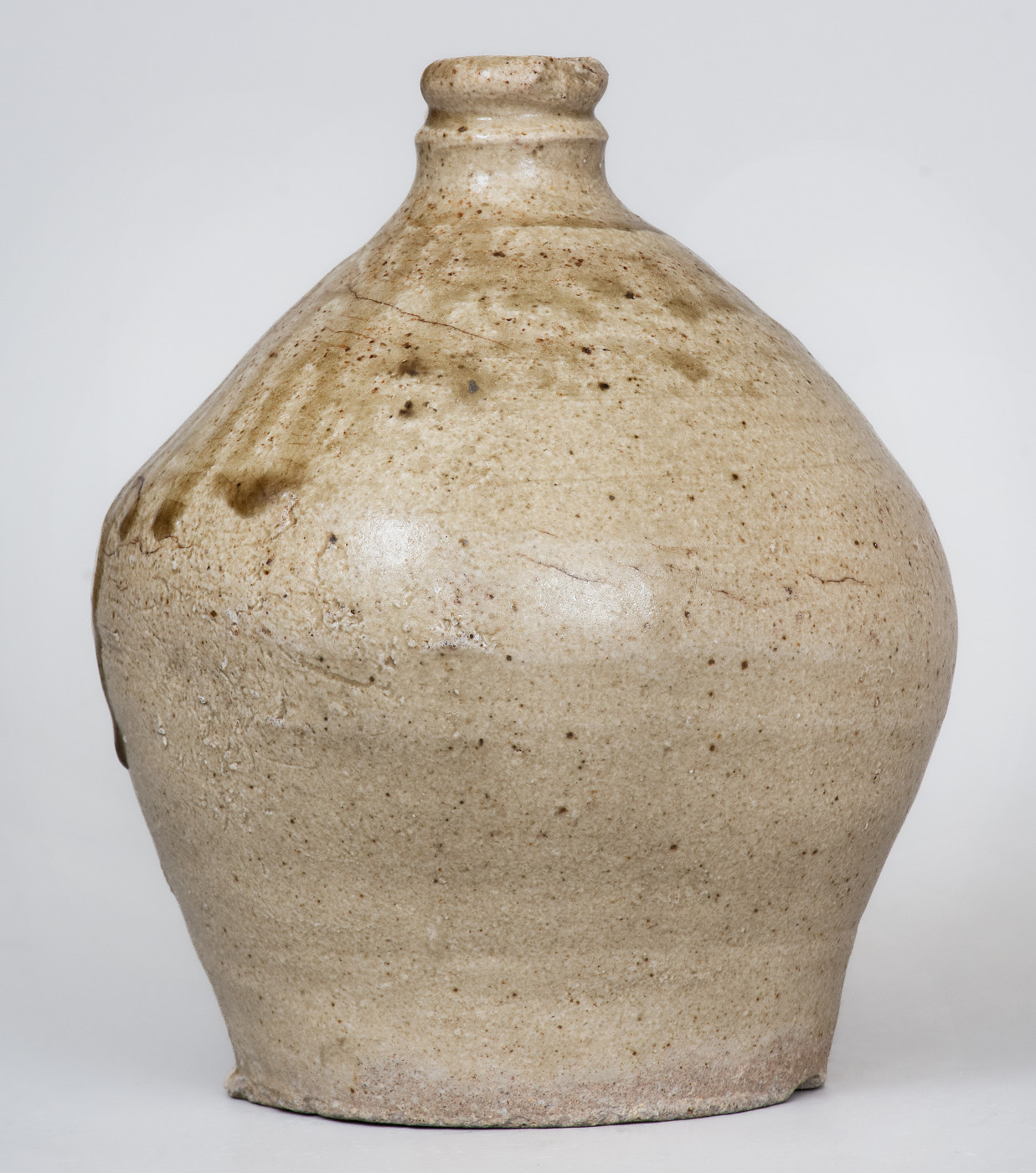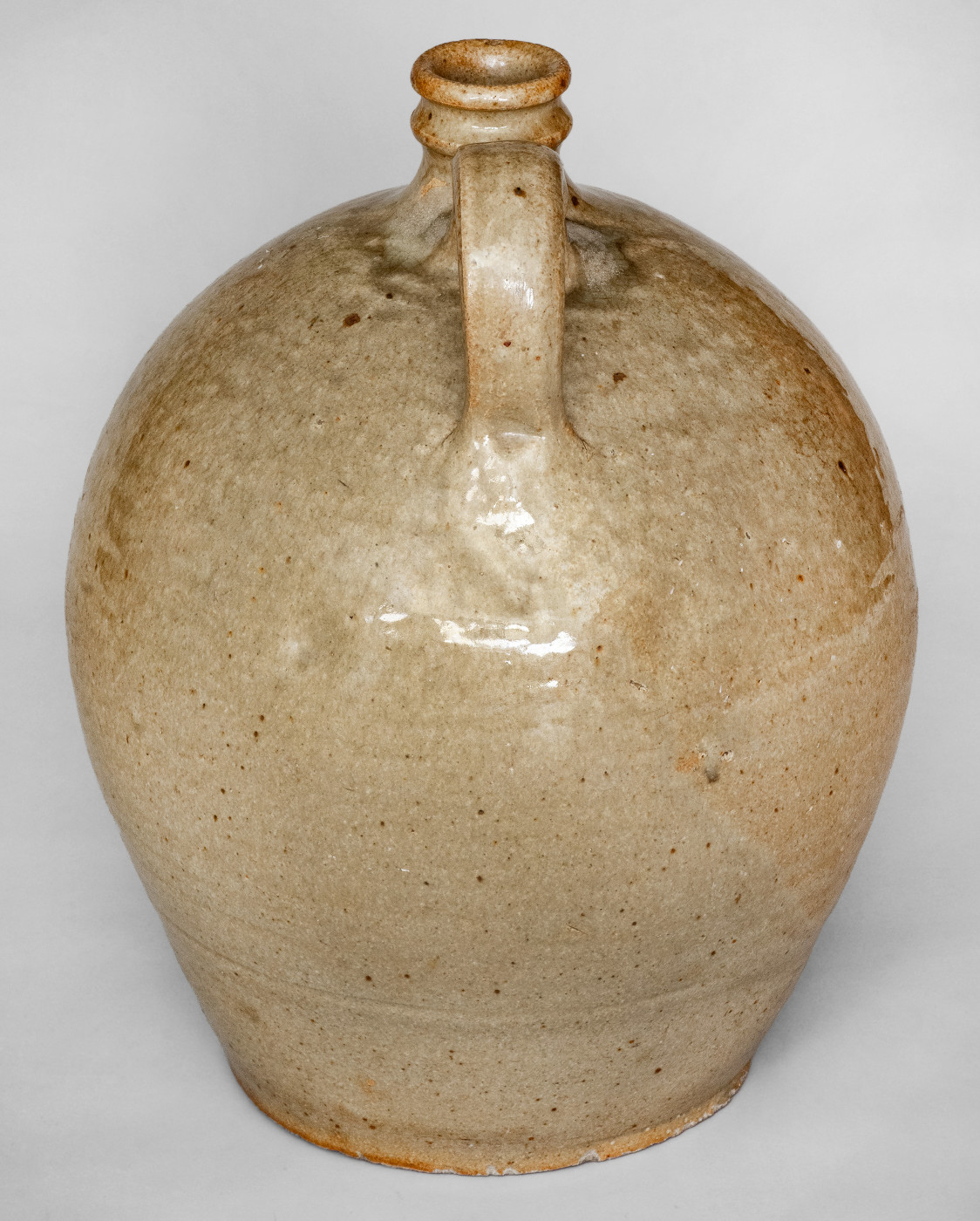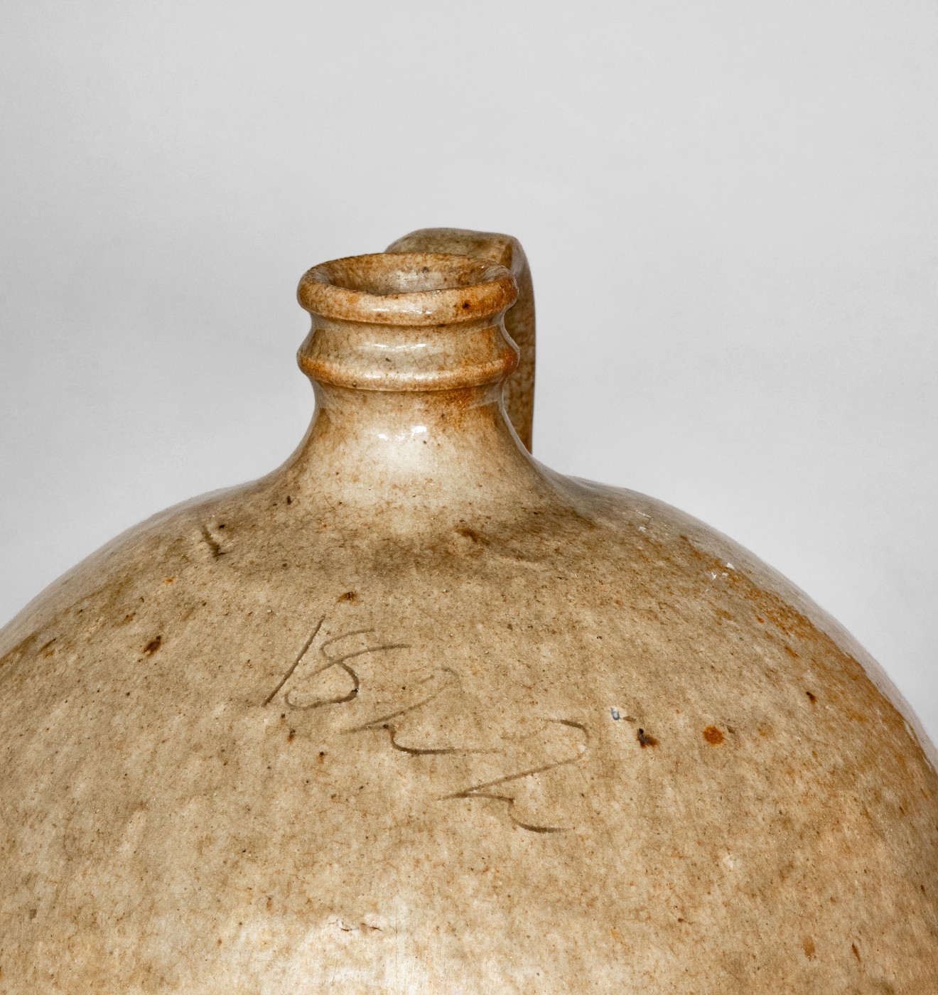 This work is distinguished as one of the very earliest examples of dated Edgefield stoneware known. Among these are a select group of pieces made at Pottersville dated between 1820 and 1822. A highly important bottle, signed and dated "A. Landrum / July 20th 1820," made by Pottersville Stoneware Manufactory founder, Abner Landrum, is currently on display at the William C. and Susan S. Mariner Gallery at the Museum of Early Southern Decorative Arts in Winston-Salem, NC. A famous jug, closely-related in form to the jug in this auction, bears the date, "1821," and is also on display at the Mariner Gallery. The 1821 jug is illustrated in Todd's Carolina Clay on the second page of the book's color plate insert. Todd describes that jug thusly: "The profile of this unsigned vessel is almost identical to that of a signed Dave jug of 1853, which suggests that Dave made both of them. If so, this jug is his earliest known work, turned at Pottersville when he was about twenty years old" (Todd, color plate insert). Two documented Pottersville jars date to this time period as well; an ovoid jar with numerous impressed circles, dated 1821, and a second jar with seven B stamps, dated "July the 30th 1822," both of which are illustrated in Hunter and Heubach, "Visualizing the Stoneware Potteries of William Rogers of Yorktown and Abner Landrum of Pottersville," Ceramics in America 2019, figs. 15 and 16.
