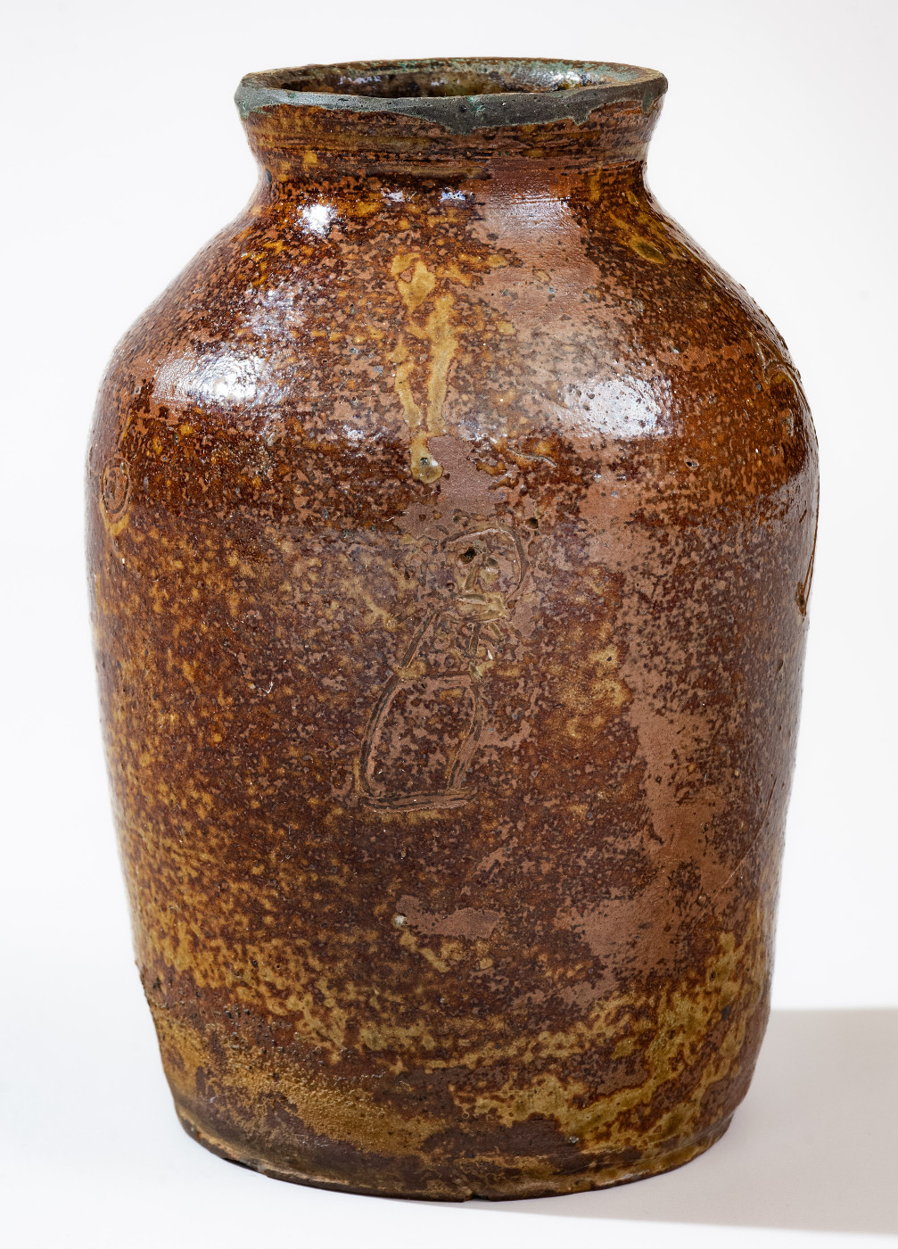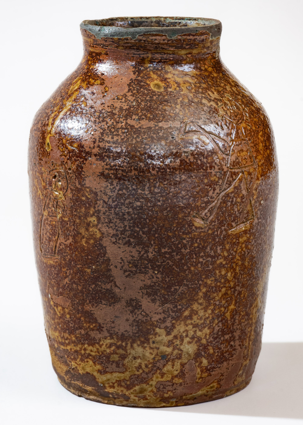 Drake Drawings. Exceedingly Rare and Important Alkaline-Glazed Stoneware Jar with Incised Human Figures and Moon, attributed to David Drake at Lewis Miles's Stony Bluff Manufactory, Edgefield District, SC, circa 1855-1860.