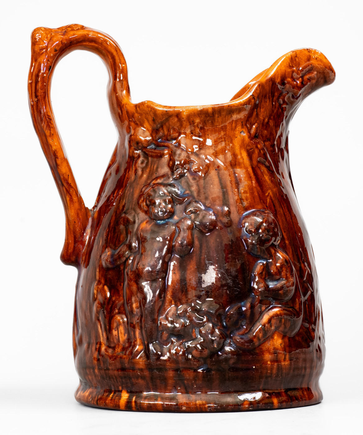 Rare Glazed Pottery Pitcher with Relief Cherub Pattern, Stamped "JOHN BELL / WAYNESBORO'," PA origin, circa 1850-1880. H 10".