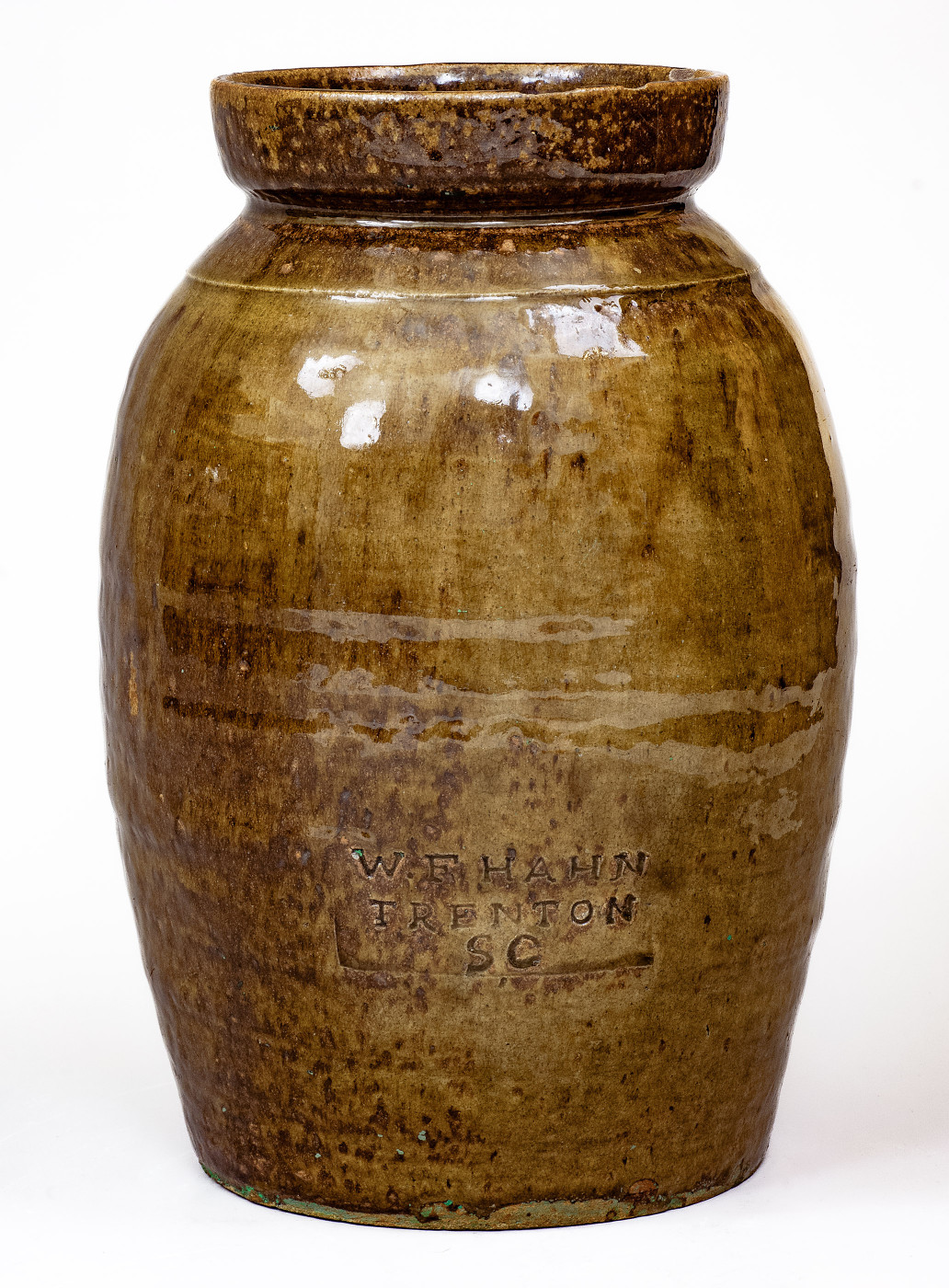 Scarce Alkaline-Glazed Handled Stoneware Jar, Stamped "W.F. HAHN / TRENTON / SC," late 19th century. Provenance: From a fifty-year SC collection. H 10 1/2".