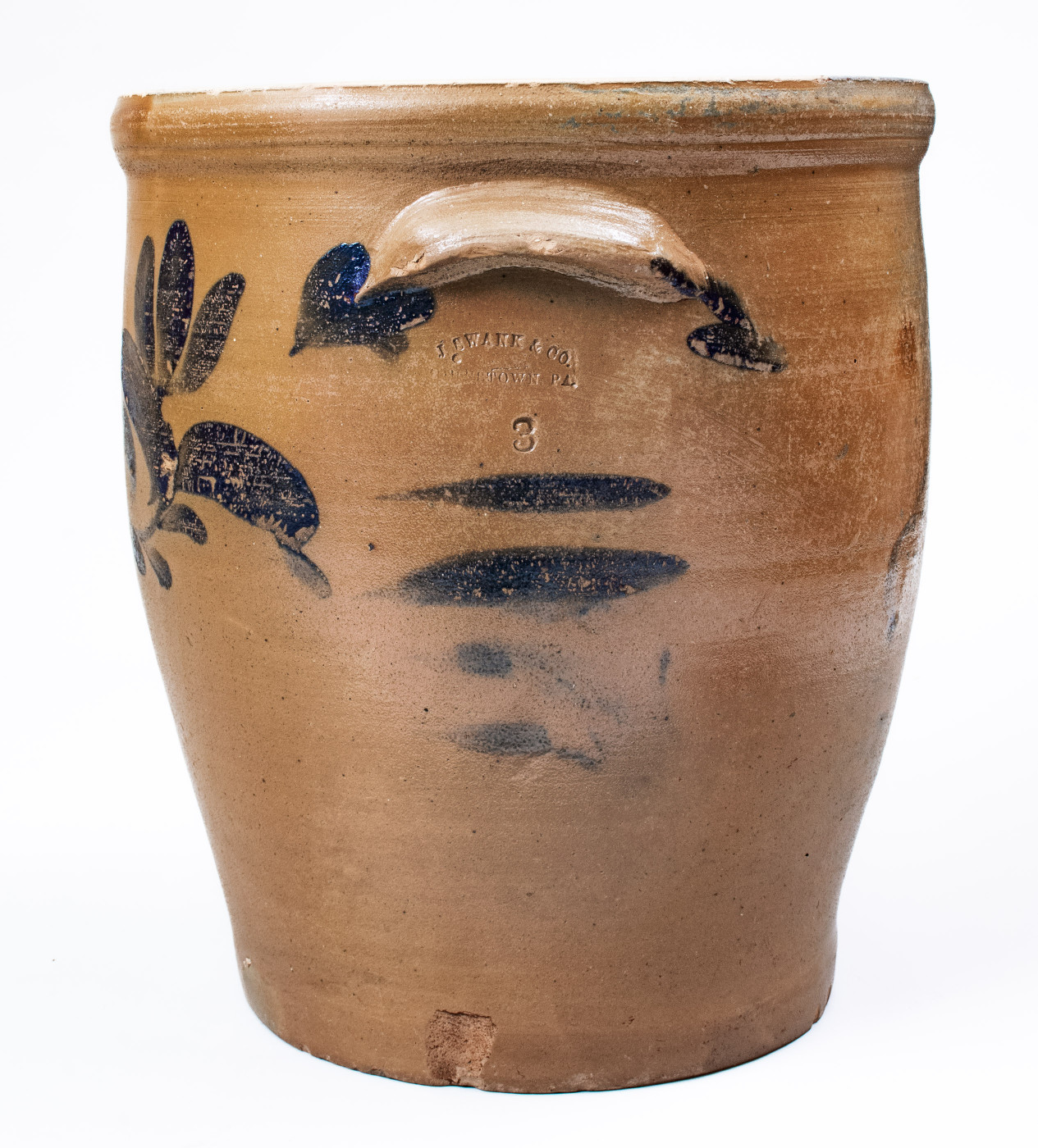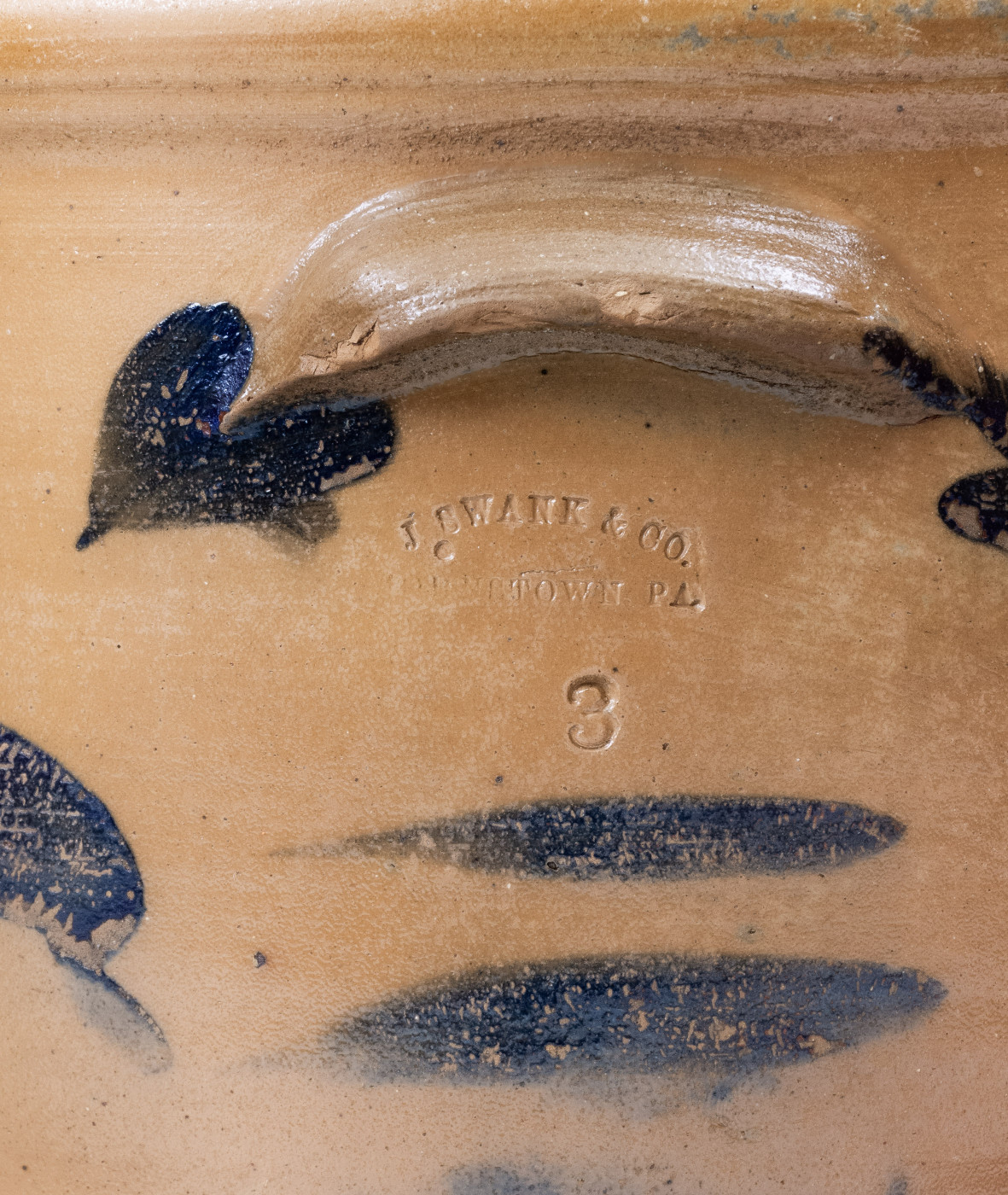 Very Rare Three-Gallon Jar with Cobalt Floral Decoration, Inscribed "Jacob J. Swank / August 18 / yer(sic) 1878," Stamped "J. SWANK & CO. / JOHNSTOWN, PA," 1878. H 12 7/8".