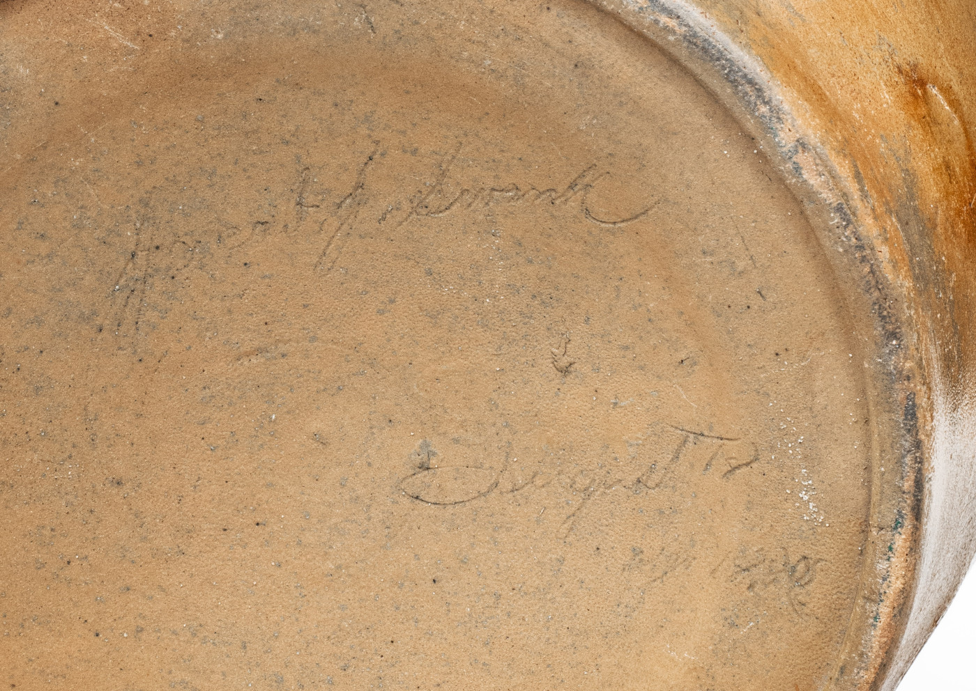 This vessel's combination of monumental size (well over two feet tall), desirable form, over-the-top decoration, and inscriptions for both the owner and maker, place this work among the most outstanding examples of Ohio stoneware to come to auction in years. H 28 1/2".
