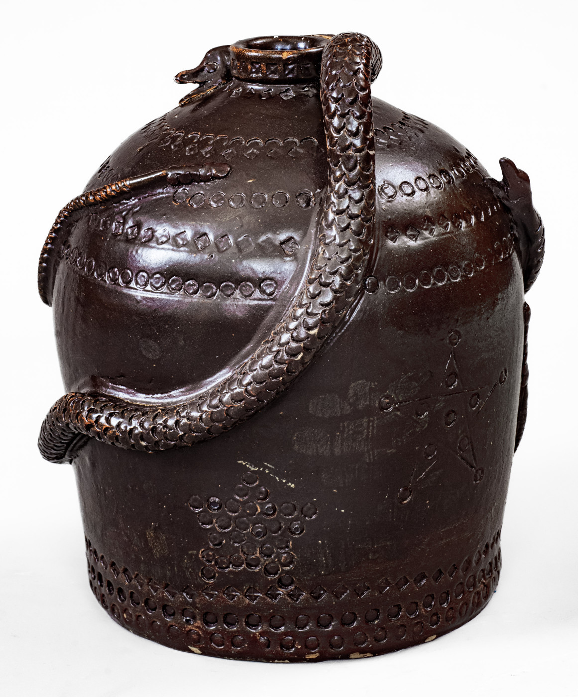 Rare Albany-Slip-Glazed Stoneware Temperance Jug with Applied Snake Decoration, Inscribed "Take Care they Will Bite," OH origin, circa 1880. A wonderful example of ceramic folk art, this work shares some similarities in its form and bold use of impressed decoration to a jug inscribed "Christy town Pottery Works / Nov 27th 1883," made in Mahoning County, Ohio, and sold in Crocker Farm's Summer 2023 Auction, lot 88. H 9 7/8".