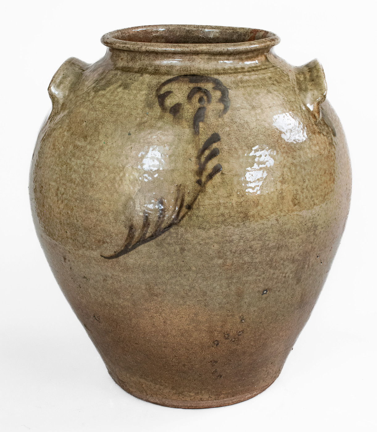 Large-Sized Alkaline-Glazed Stoneware with Iron-Slip Floral Decoration, attributed to Thomas Chandler, Edgefield District, SC, circa 1850. Provenance: From a fifty-year SC collection. H 16".