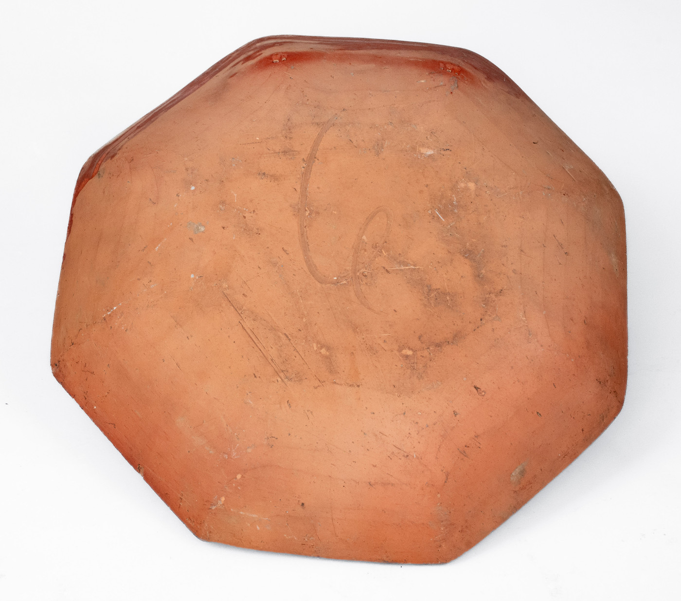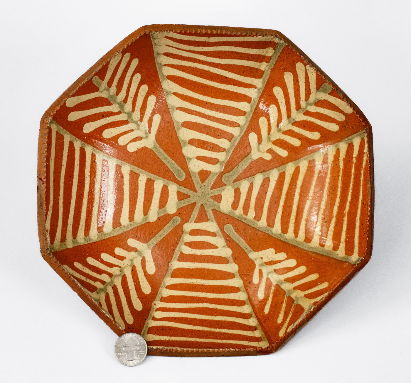 Outside of a commonly-produced form by the Bell family, octagonal dishes are extremely rare in 19th century American redware production. Besides a number of these Bell examples, we have previously offered only one octagonal redware dish in over twenty years in operation, a miniature yellow-slip-decorated example sold as lot 262 in our Summer 2021 auction. A significant example of Pennsylvania slipware, the work offered in our Fall 2025 auction is made extraordinary through its combination of an elusive form, over-the-top decoration, and immaculate condition. Among the finest American redware dishes to come to auction in recent years. Diam. 9 3/4".