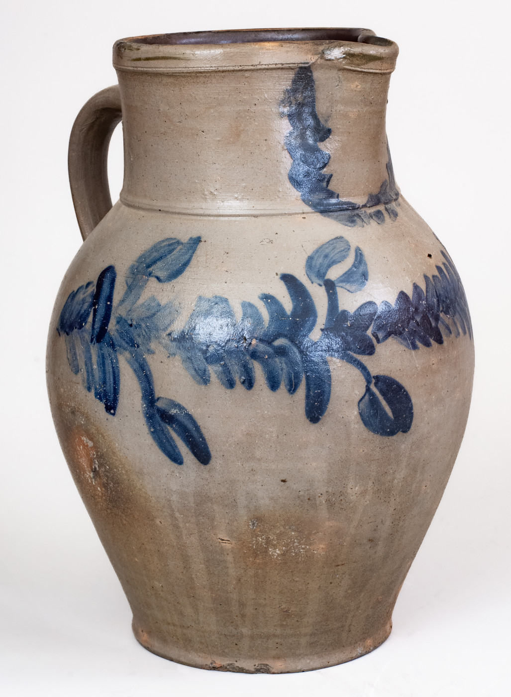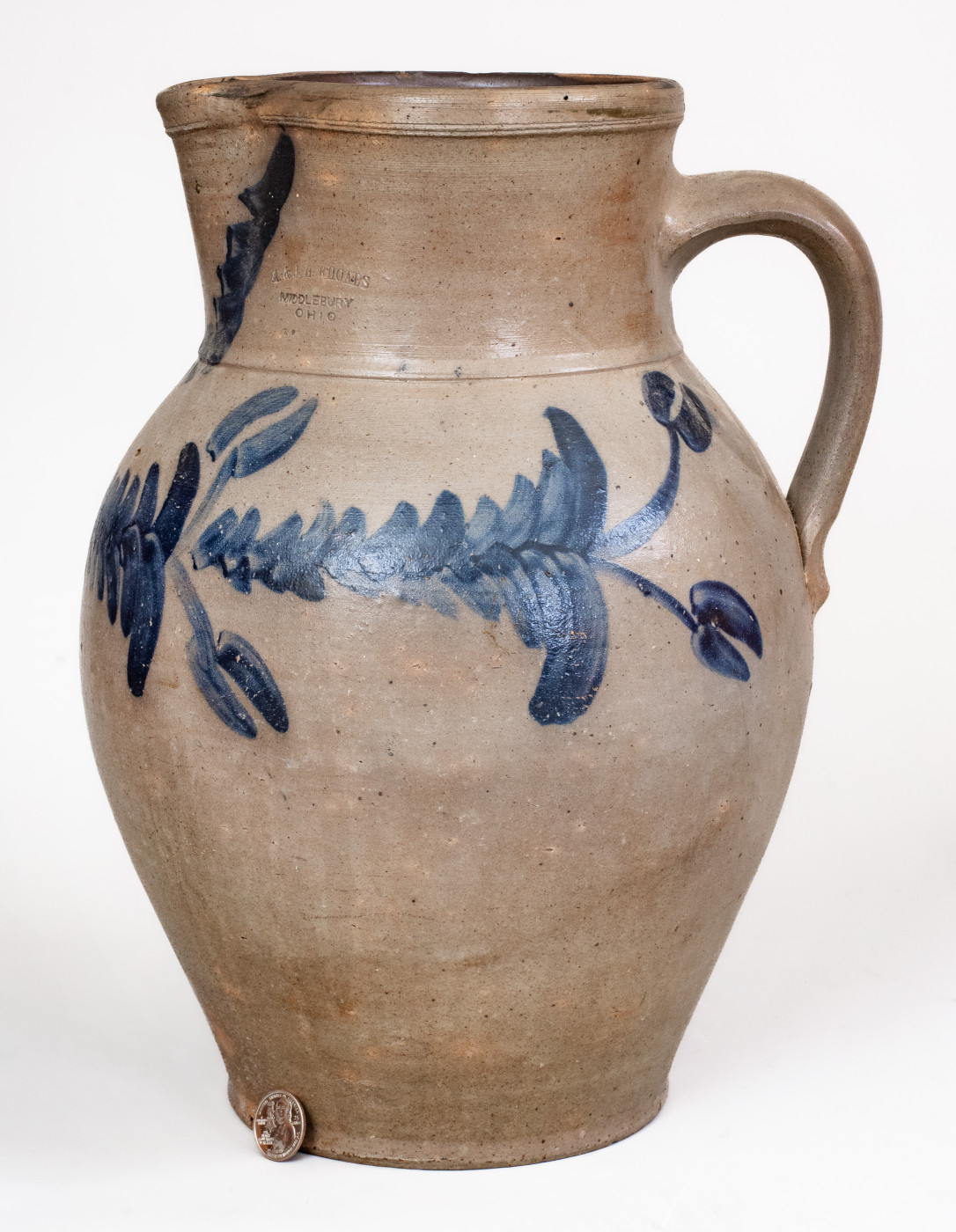 Extremely Rare Three-Gallon Stoneware Pitcher with Elaborate Cobalt Floral Decoration, Stamped "A. & J. G. RHOADS / MIDDLEBURY / OHIO," mid 19th century.