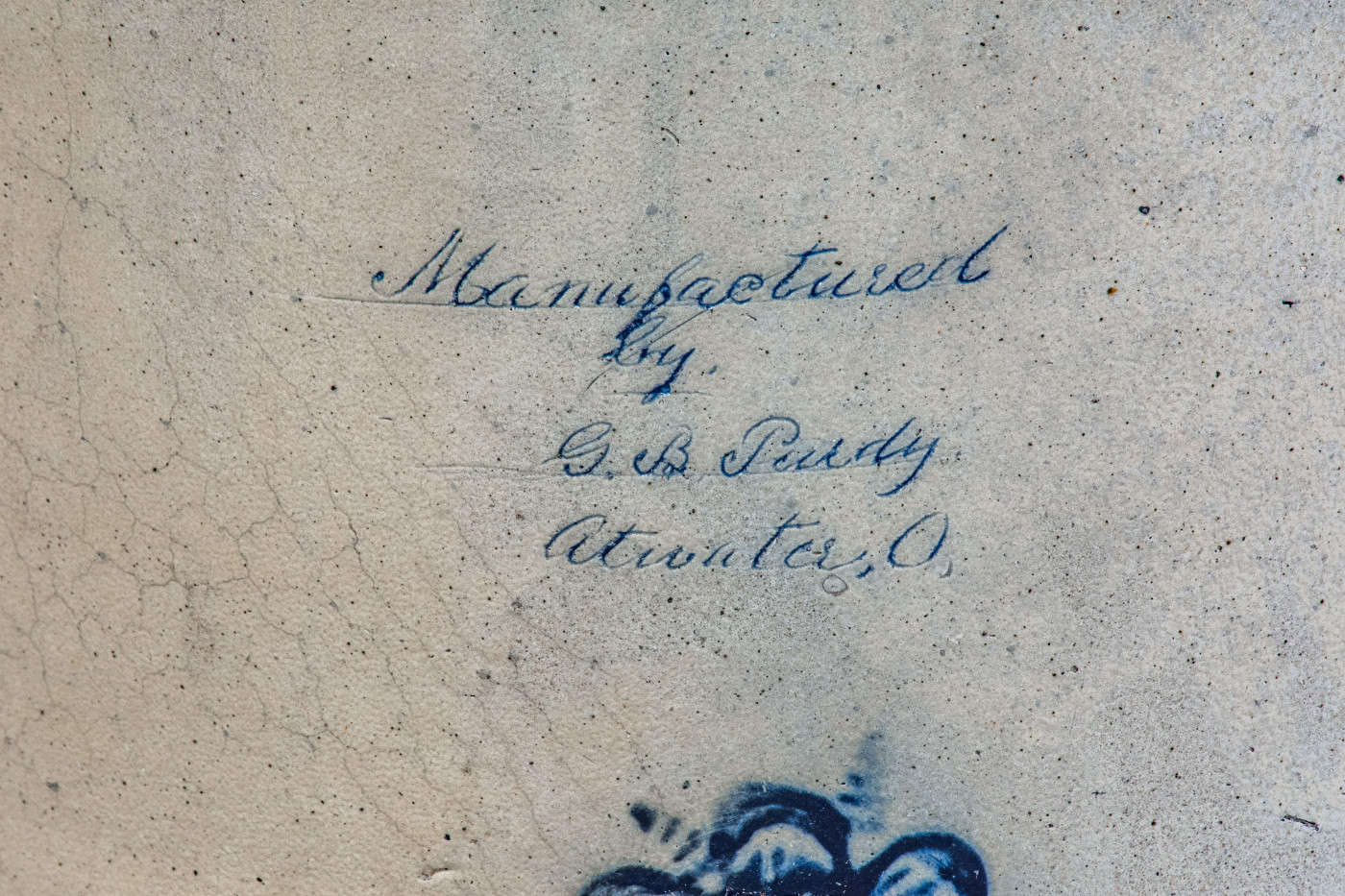 Brought up in the stoneware business (son of well-known Solomon Purdy, 1779-1854), Gurdon Purdy was certainly trained by his father, who came from Vermont to Zanesville in the 1810's, then moved to Springfield (near Akron) by the 1820's. In the 1860 federal census Gurdon appears in Atwater as a potter with substantial real estate, and this would have been roughly when the cooler was made. Interestingly, Gurdon Purdy and Henry King are buried in the same cemetery, Hope Cemetery in Salem.