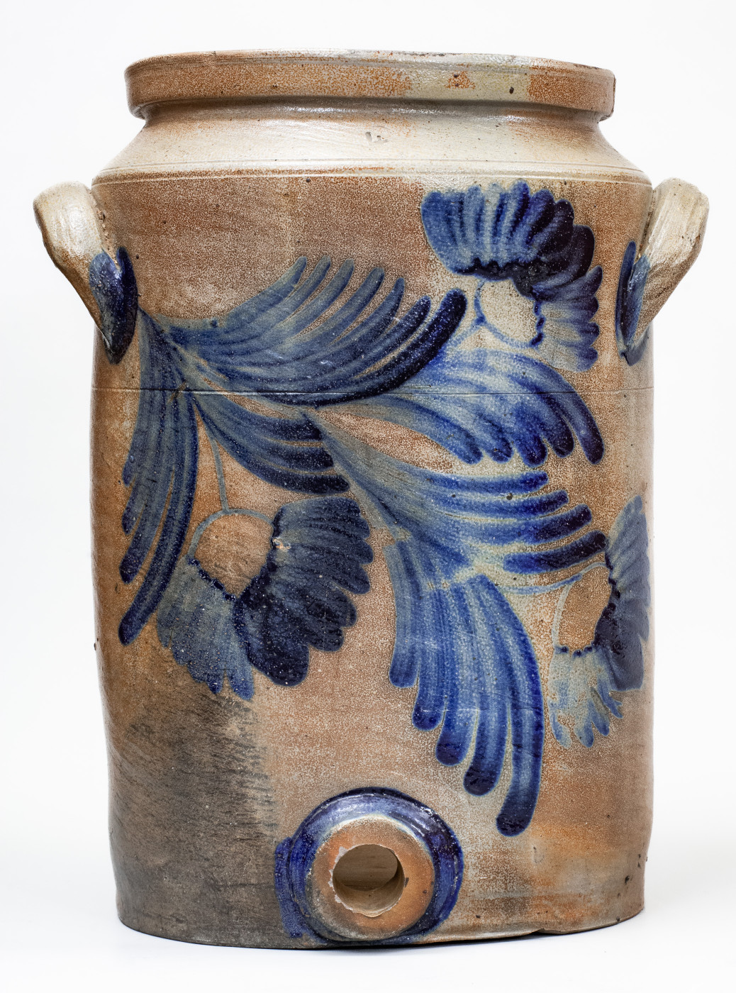 This cooler's extraordinary form and stunning decoration define it as the finest surviving example of Beaver, Pennsylvania stoneware and a masterwork by one of Western Pennsylvania's most famous and skilled potters. Provenance: A fresh-to-the-market example, which recently surfaced in the Midwestern U.S. H 19 7/8".