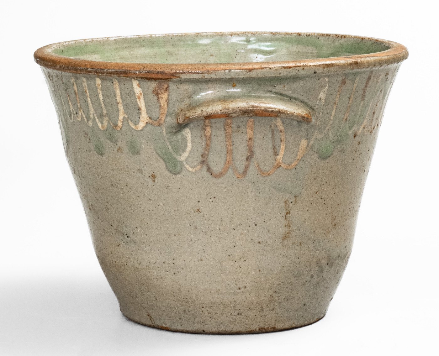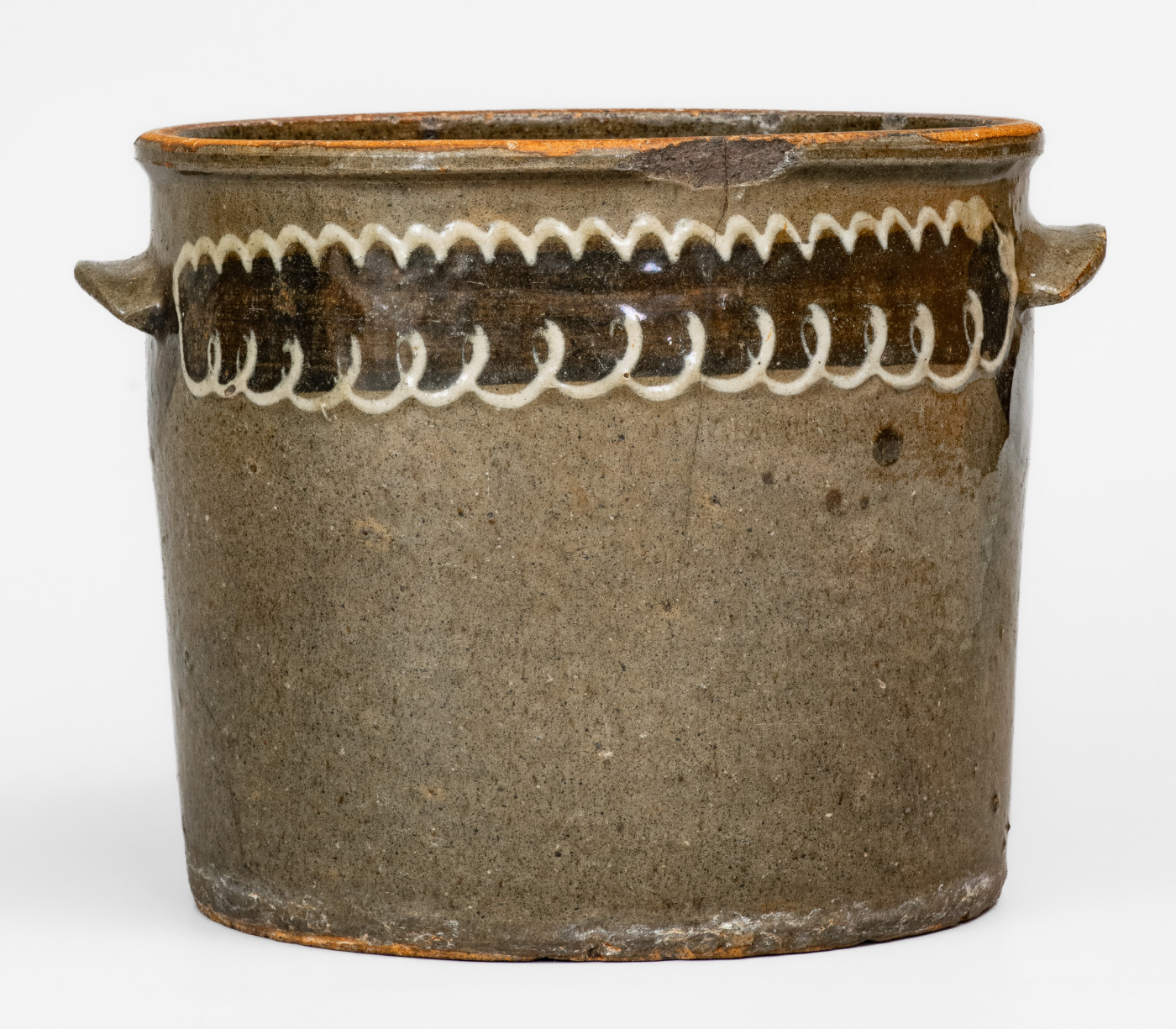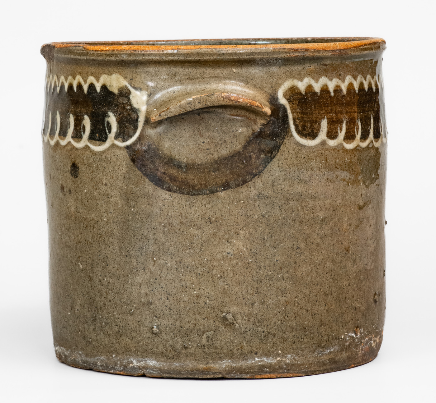 Rare and Fine Alkaline-Glazed Stoneware Cake Crock with Two-Color Slip Decoration, Edgefield District, SC origin, circa 1845-1850. Provenance: From a fifty-year SC collection. H 7 1/8" ; Diam. (at rim) 8 3/8".