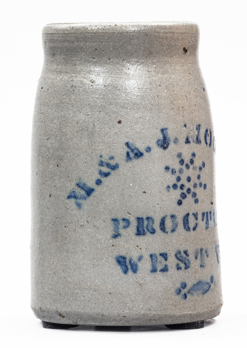 Rare and Fine Cobalt-Decorated Stoneware Canning Jar with Stenciled Star Motif and Proctor, WV Advertising, Western PA origin, circa 1875. Provenance: Early Ray Bush Collection, Huntington, WV; from a fine collection of WV stoneware offered in this auction. H 8 1/4".