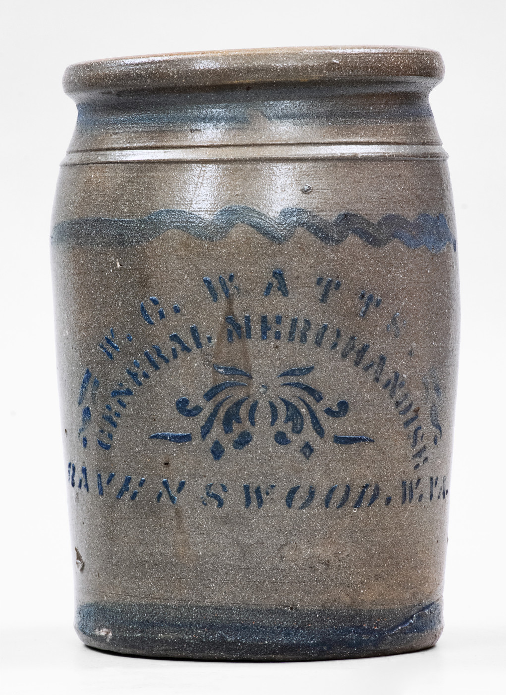 Rare One-Gallon Cobalt-Decorated Stoneware Jar with Ravenswood, WV Advertising, Western PA origin, circa 1875. From a fine collection of West Virginia stoneware offered in this auction. H 9 3/4".