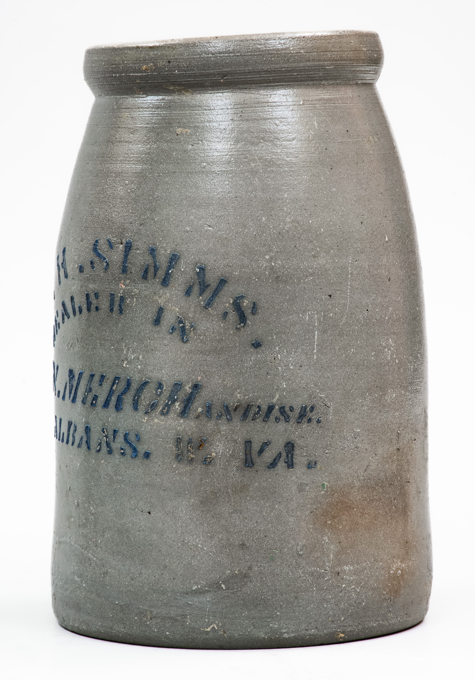 Very Rare Cobalt-Stenciled Stoneware Canning Jar with St. Albans, WV Advertising, Western PA origin, circa 1880. The first piece bearing advertising for this town that we have offered. From a fine collection of West Virginia stoneware offered in this auction. H 8 1/2".