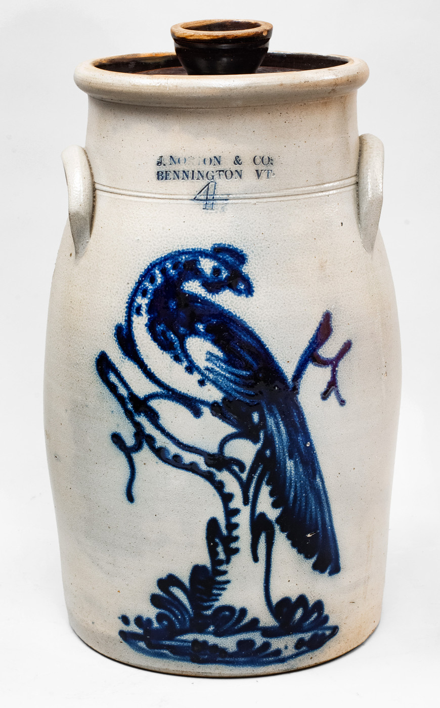 Exceptional Four-Gallon Stoneware Churn with Cobalt Pheasant-on-Stump Decoration, Stamped "J. NORTON & CO. / BENNINGTON, VT," circa 1860. Decoration stands an impressive 12 1/4" tall and features excellent color and contrast. H (excluding lid) 17".