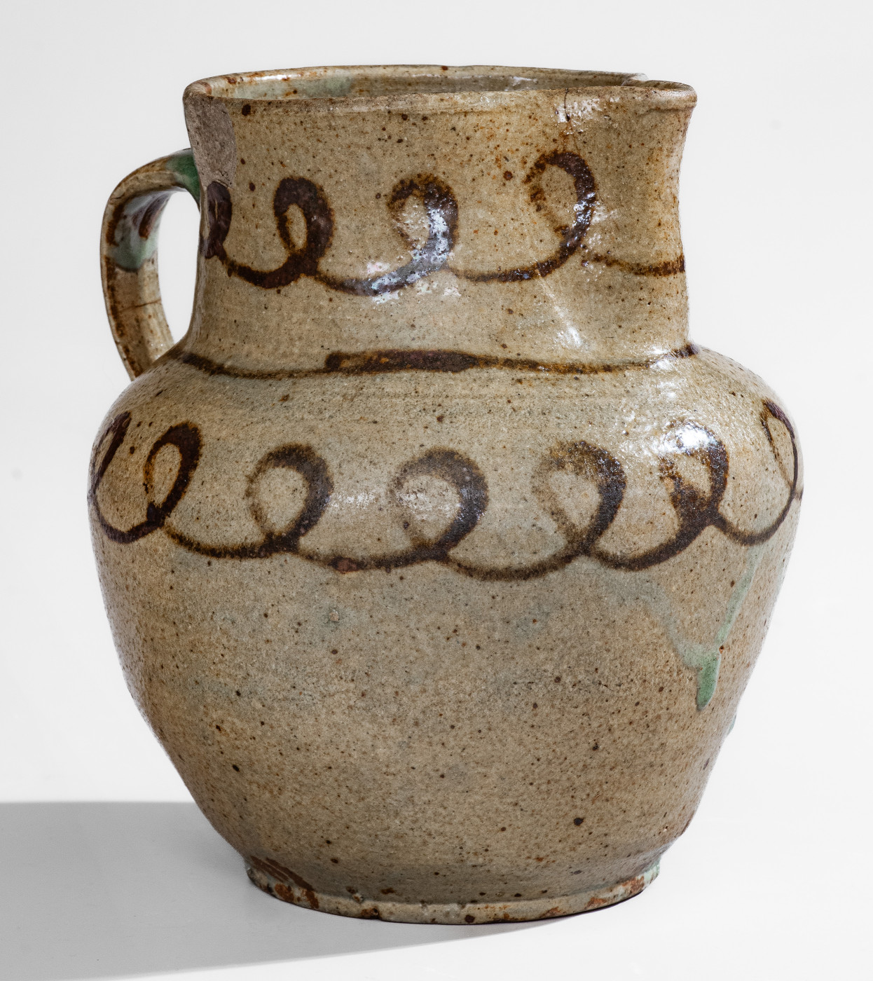 Scarce Small-Sized Alkaline-Glazed Stoneware Pitcher with Iron Slip Decoration, attributed to Thomas Chandler, Edgefield District, SC, circa 1850. Provenance: From a fifty-year SC collection. H 7".