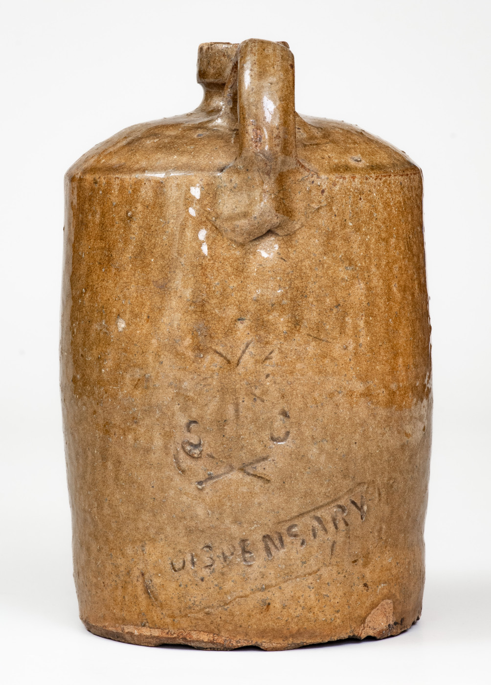 Rare Alkaline-Glazed Stoneware South Carolina Dispensary Jug, Stamped "S.C. DISPENSARY," attributed to J. G. Baynham, Trenton, Edgefield District, SC, late 19th century. Provenance: From a fifty-year SC collection. H 9 3/4".