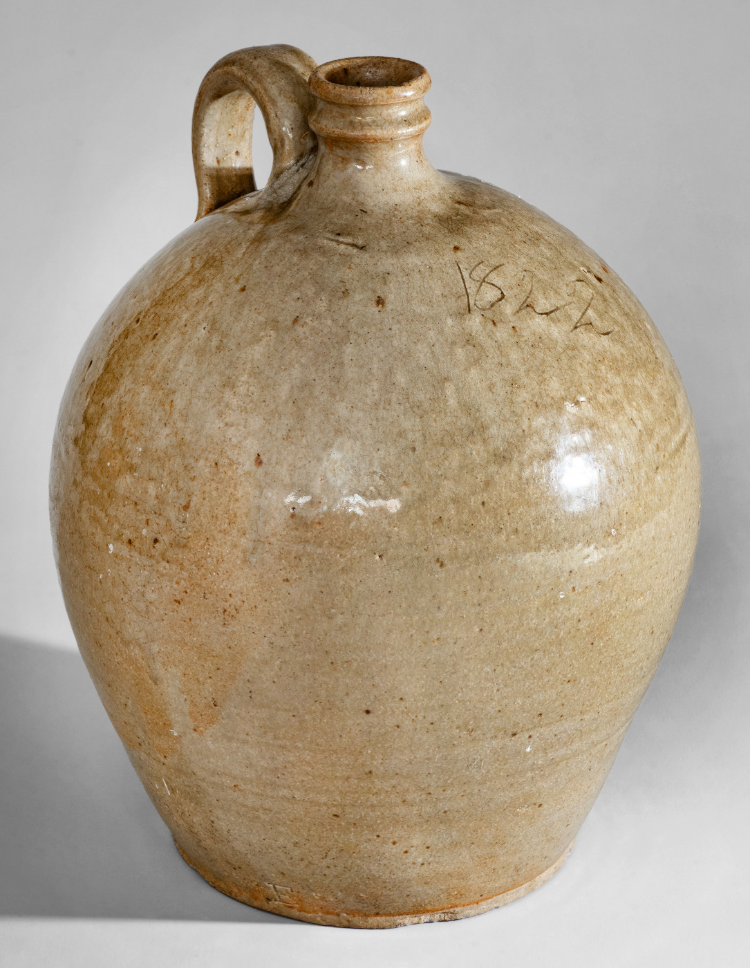 As one of the earliest dated Edgefield stoneware pieces known and possibly one of the earliest pieces of inscribed David Drake stoneware in existence, the importance of this lot is difficult to overstate. Pairing with its extremely rare and early date are fine craftsmanship, glazing, and condition to the vessel. Literature: For a related 1821 jug, see Todd, Carolina Clay, color insert, and Baldwin, Great and Noble Jar, p. 40, fig. 2.9. For related jars dated 1821 and July the 30th 1822, see Hunter and Heubach, "Visualizing the Stoneware Potteries of William Rogers of Yorktown and Abner Landrum of Pottersville," Ceramics in America 2019, figs. 15 and 16. Provenance: From a fifty-year SC collection. H 13 1/2".