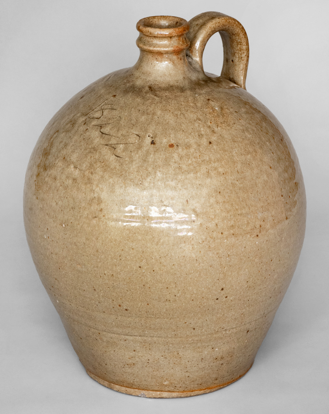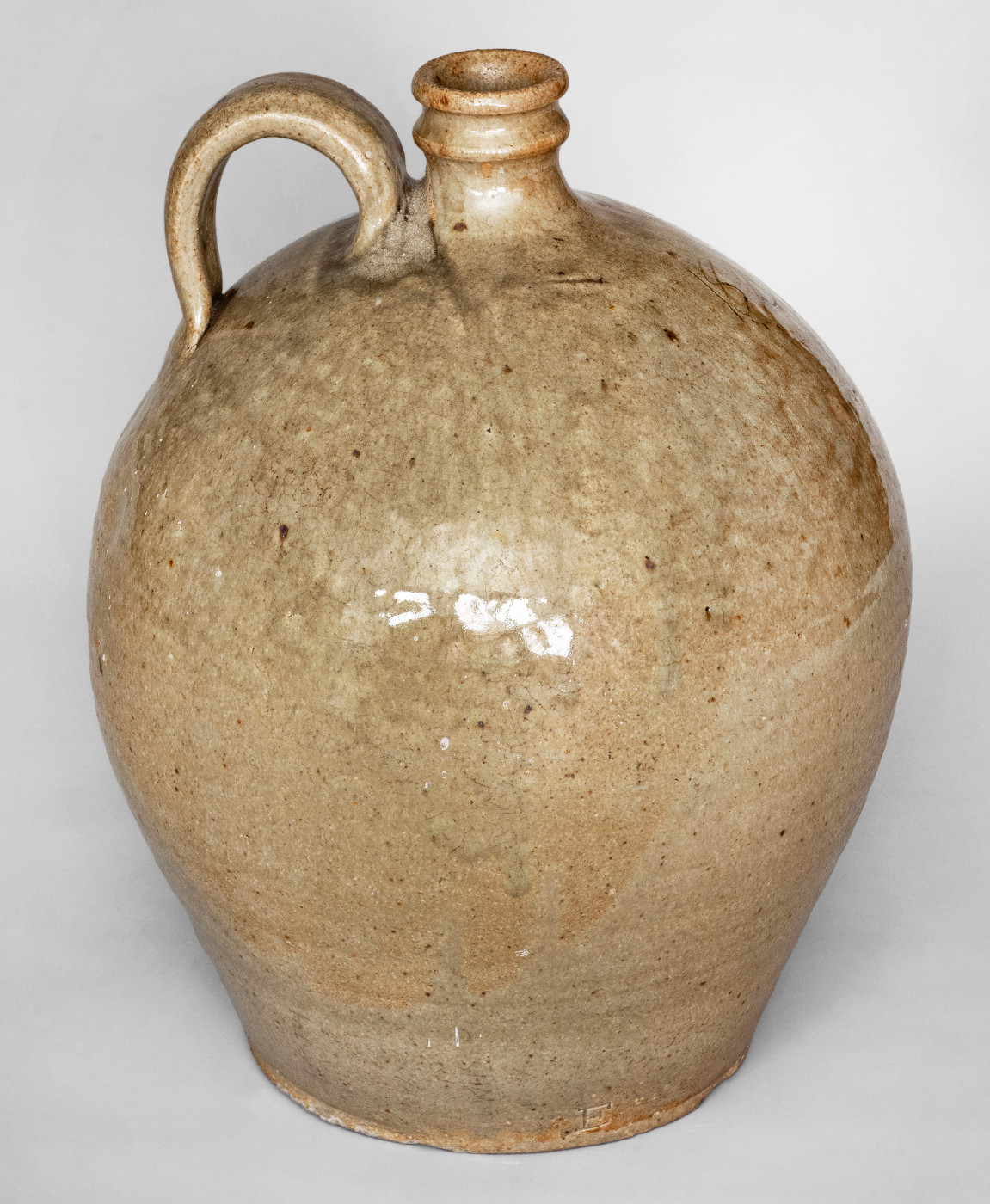 Early Edgefield. Exceedingly Rare and Important Two-Gallon Alkaline-Glazed Stoneware Dated Jug, Inscribed "1822" and Stamped "E," Pottersville Stoneware Manufactory, probably David Drake, Edgefield District, SC, 1822.