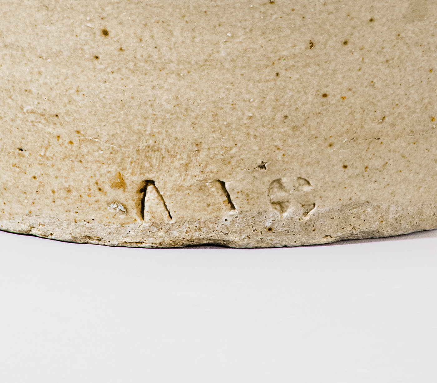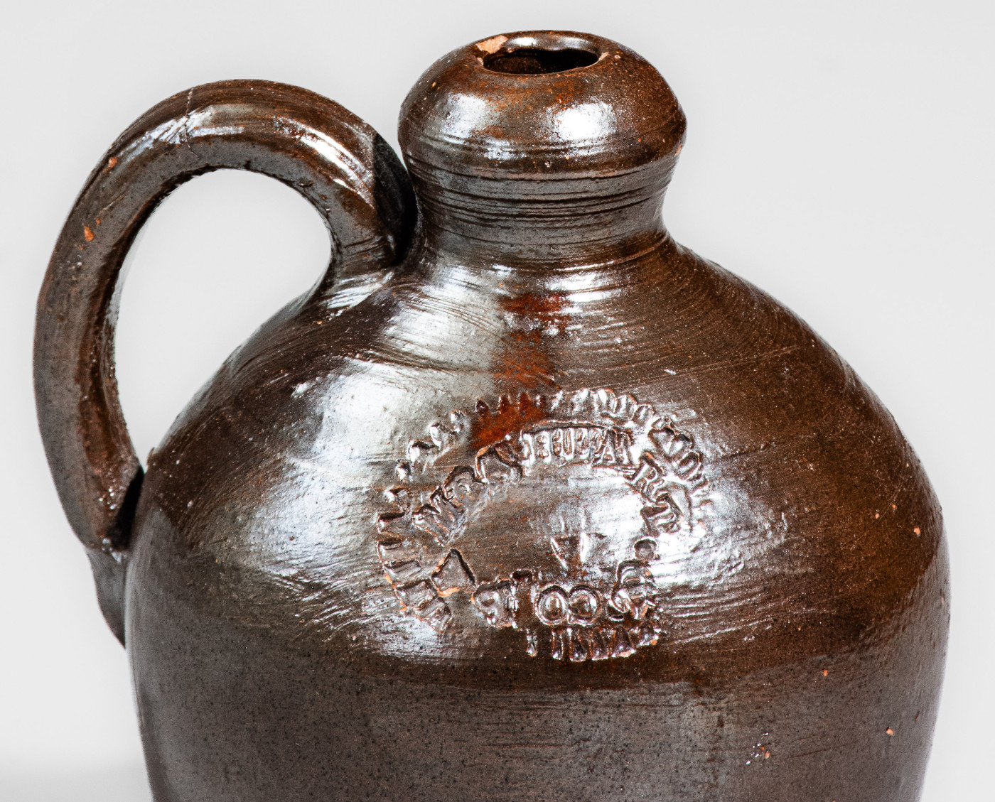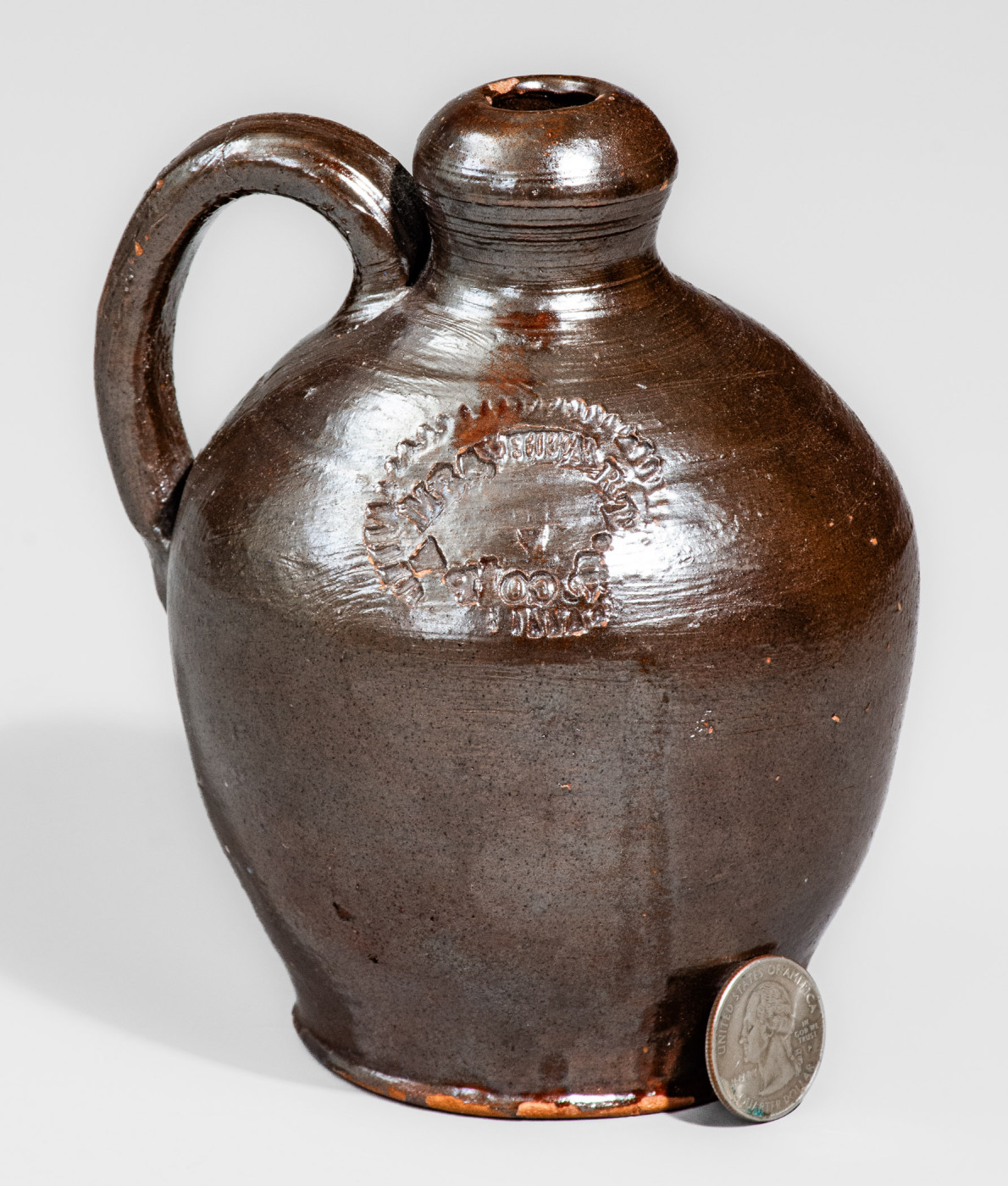Triple Stamping. Exceptional Triply-Stamped Stoneware Jug with Alkaline Glaze, attributed to Pottersville Stoneware Manufactory, Edgefield District, SC, circa 1825. Base impressed with diagonal I, inverted V, and cross-within-circle stamps. Among the finest two-toned Pottersville pieces that we have ever offered, distinguished by its highly unusual multiple stamps to the base. Provenance: From a fifty-year SC collection. H 10 1/4".